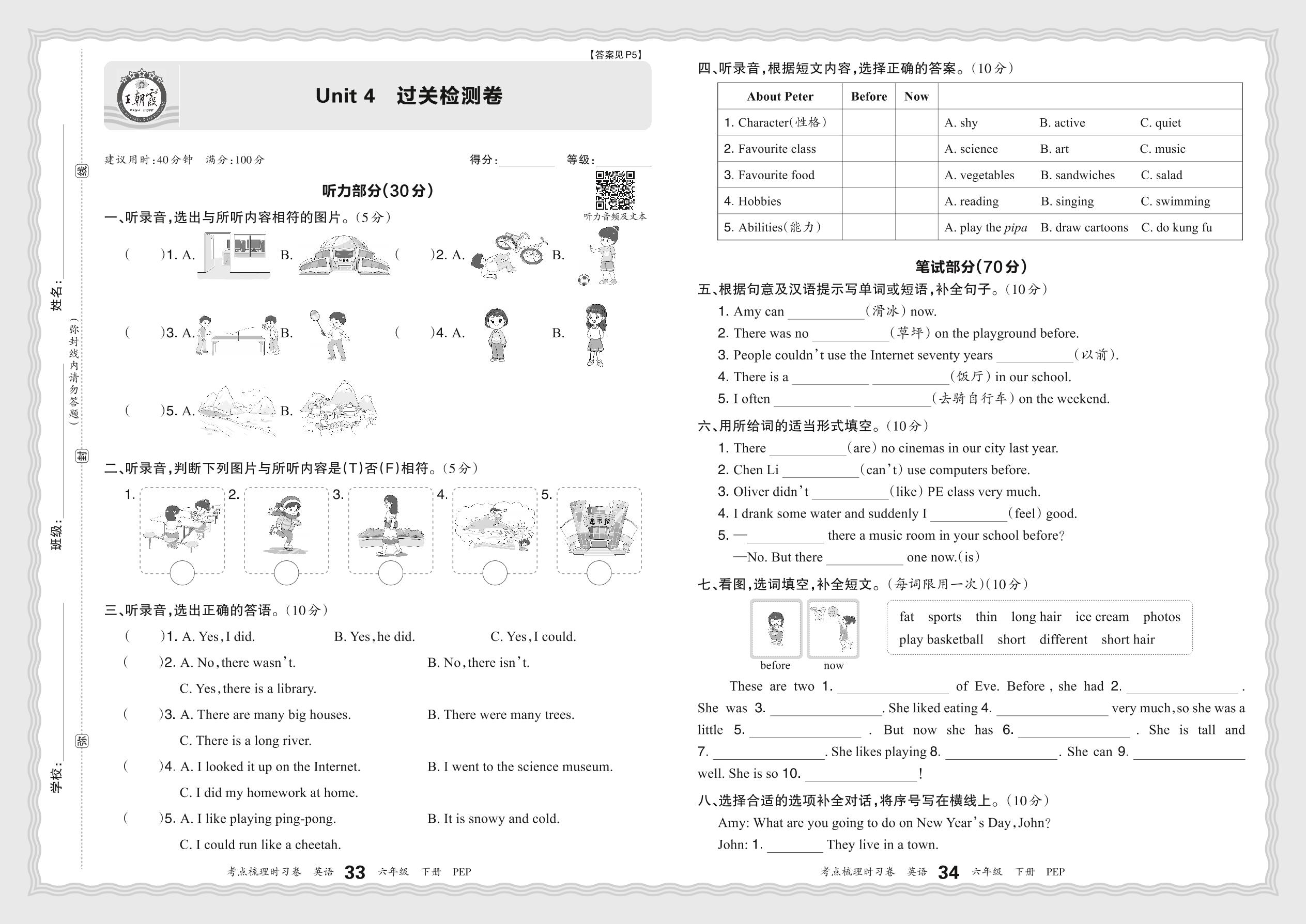 2024春下册六年级英语人教PEP版 Unit 4 过关检测卷