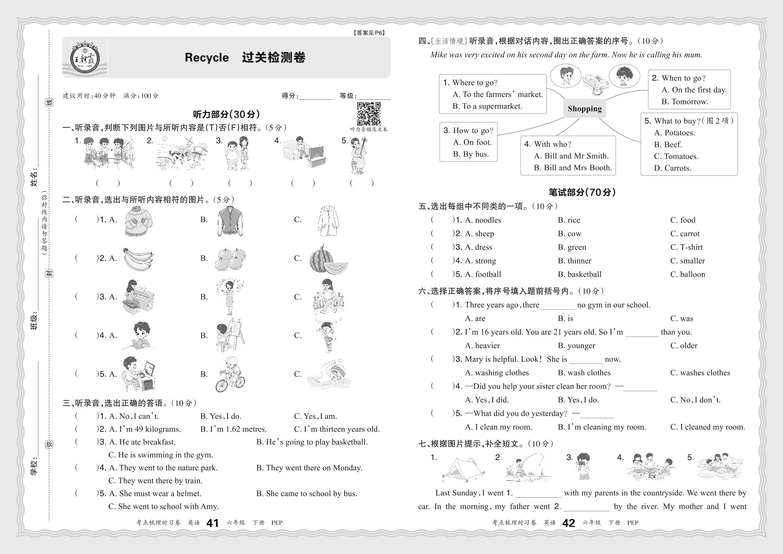 2024春下册六年级英语人教PEP版 Recycle 过关检测卷