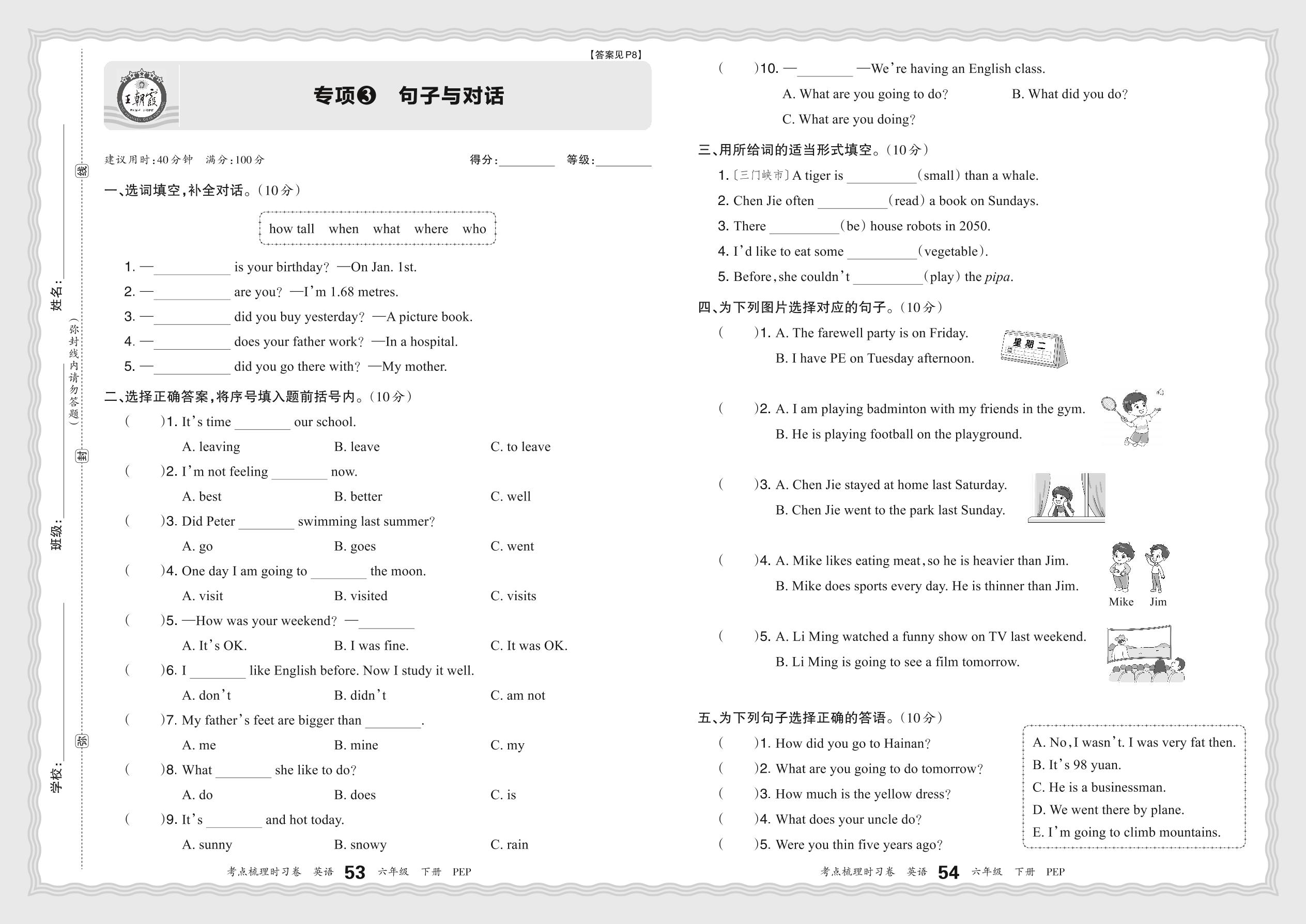 2024春下册六年级英语人教PEP版 期末专项卷KD版·句子与对话【3】