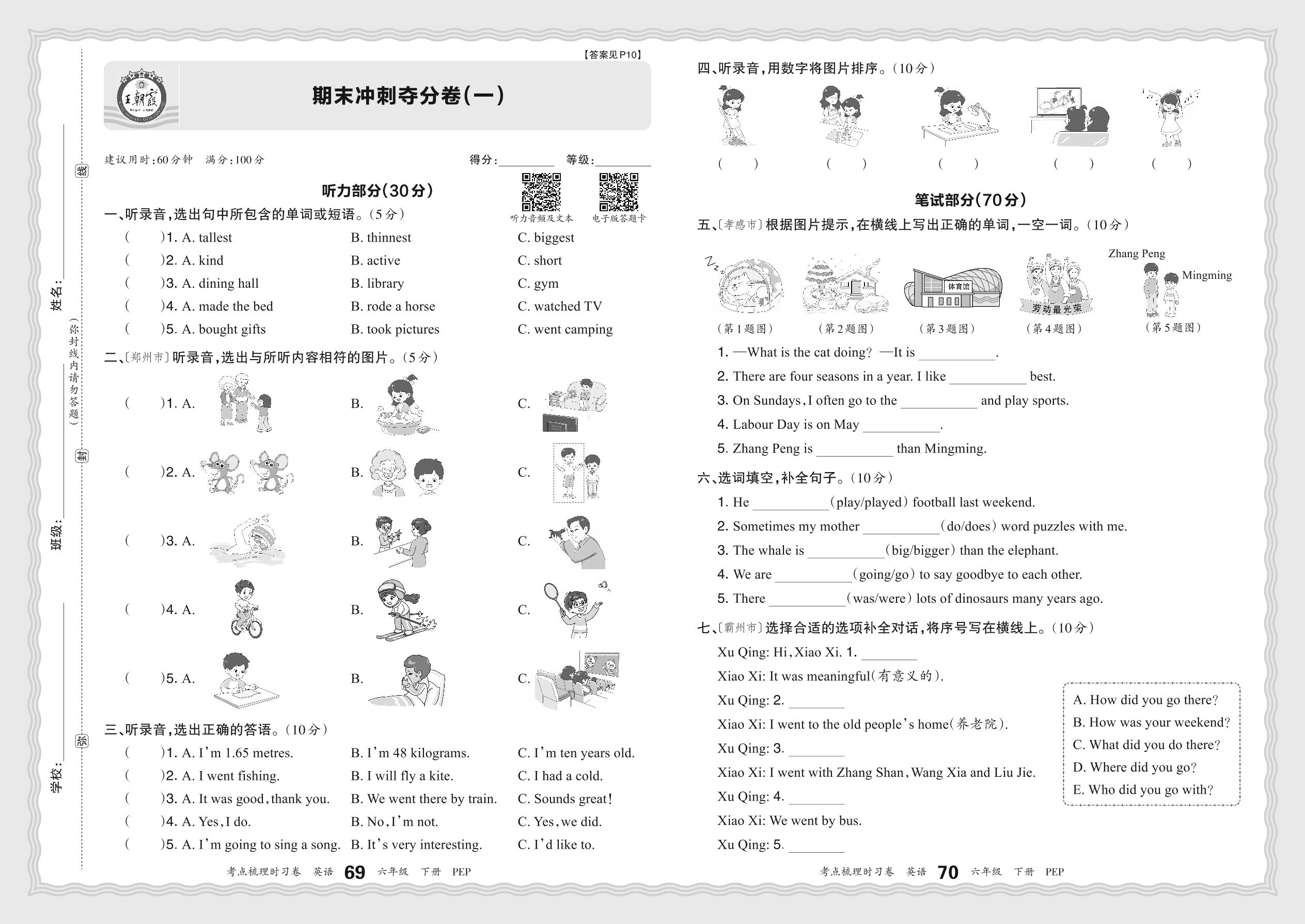 2024春下册六年级英语人教PEP版 期末冲刺夺分卷(一)