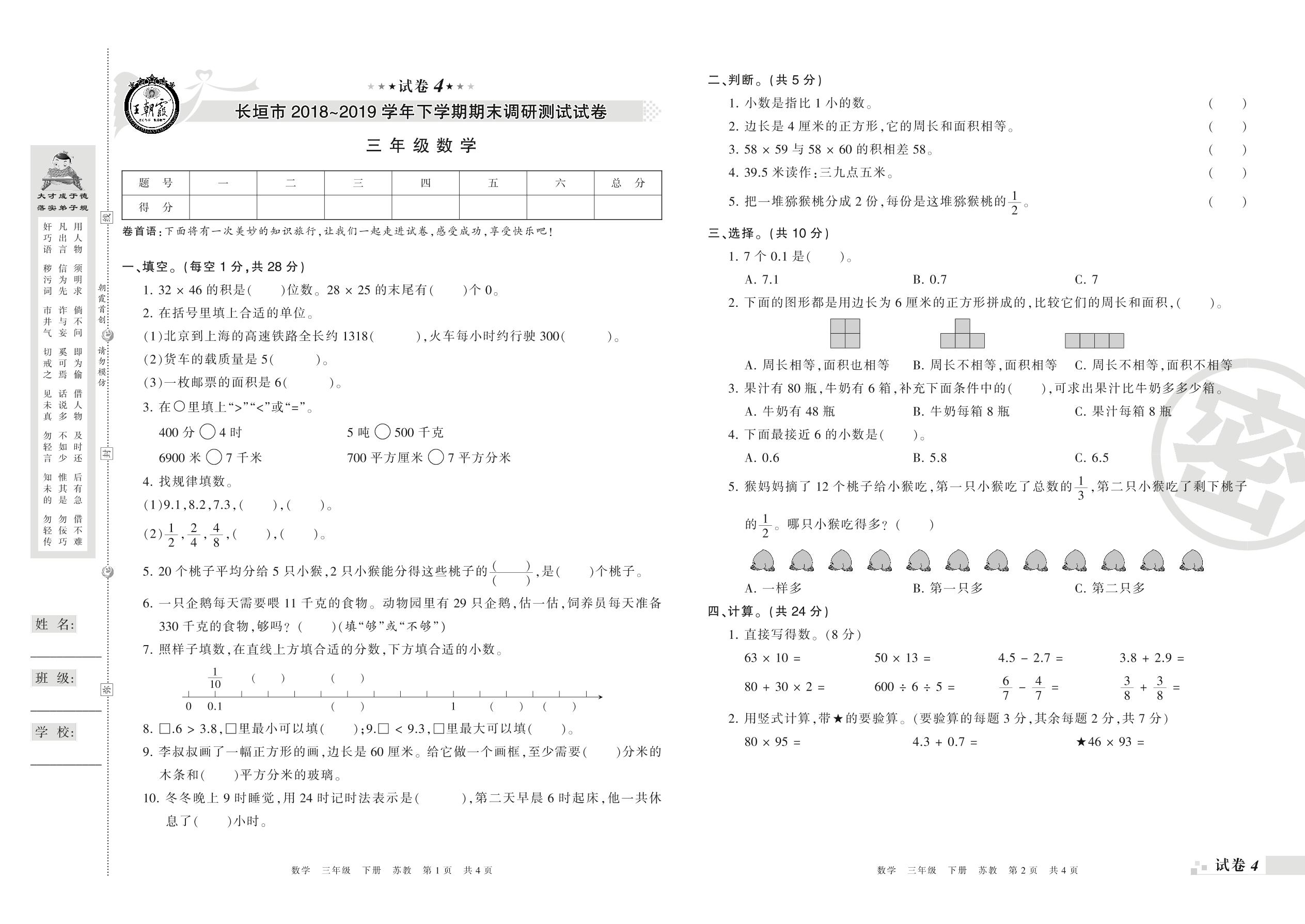 2018-2019学年第二学期长垣市三年级数学试卷(苏教版)【4】