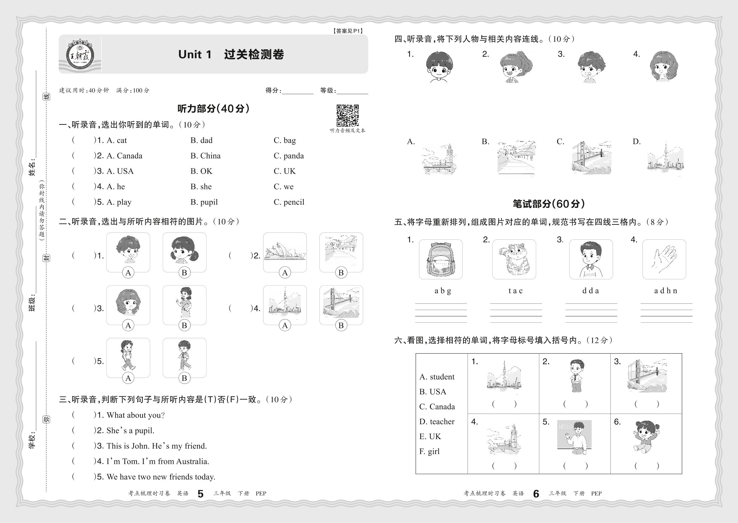三年级英语人教PEP版(三起始)下册单元卷