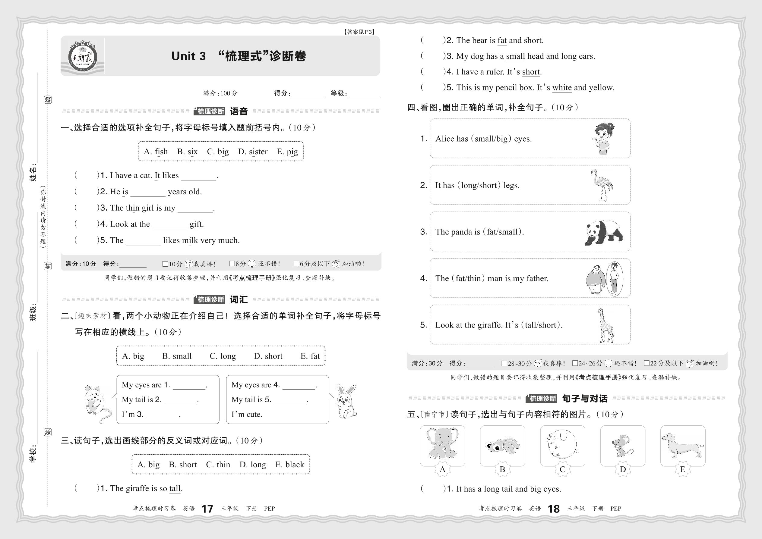 2024春下册三年级英语人教PEP版 Unit 3 “梳理式”诊断卷