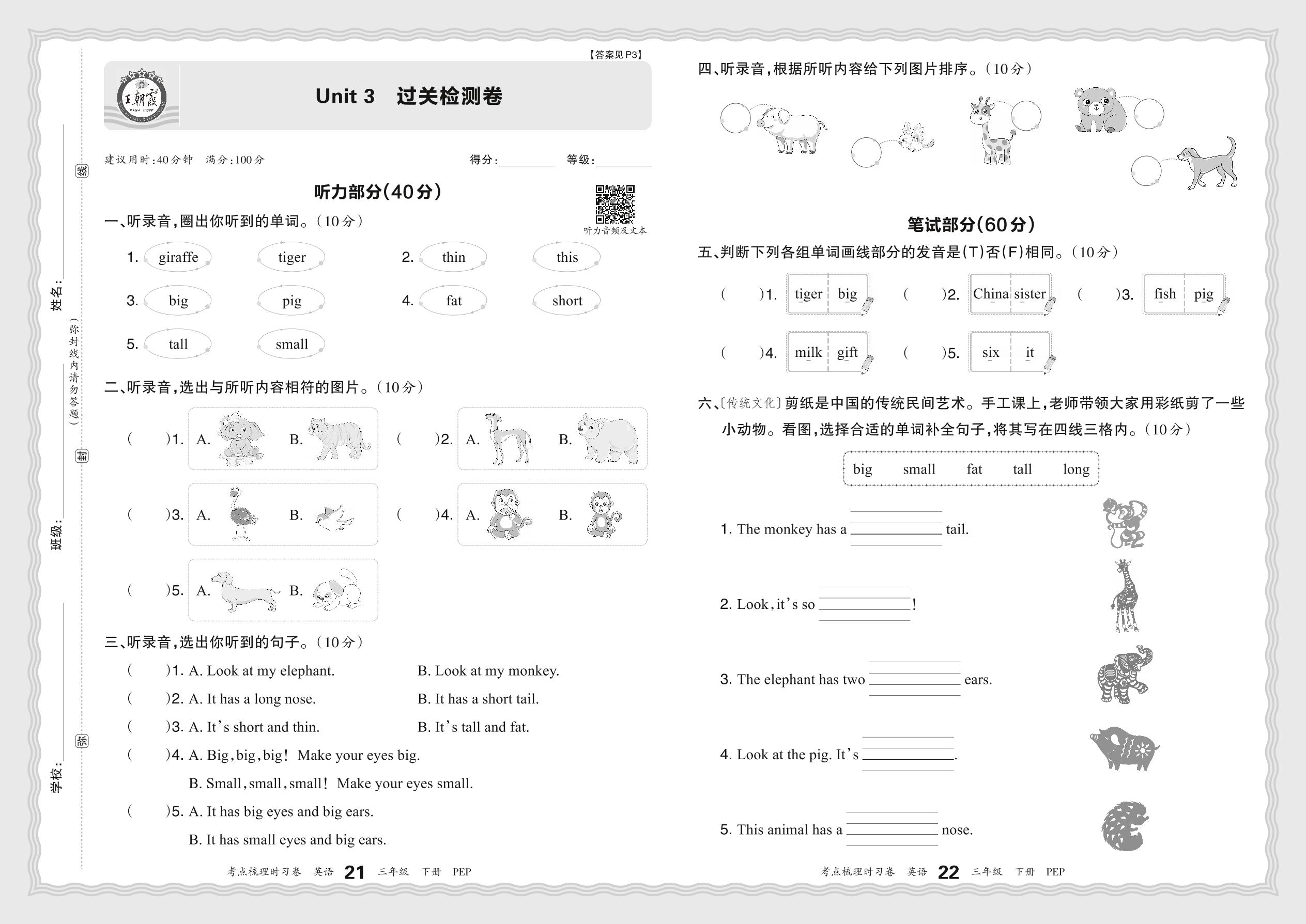 2024春下册三年级英语人教PEP版 Unit 3 过关检测卷
