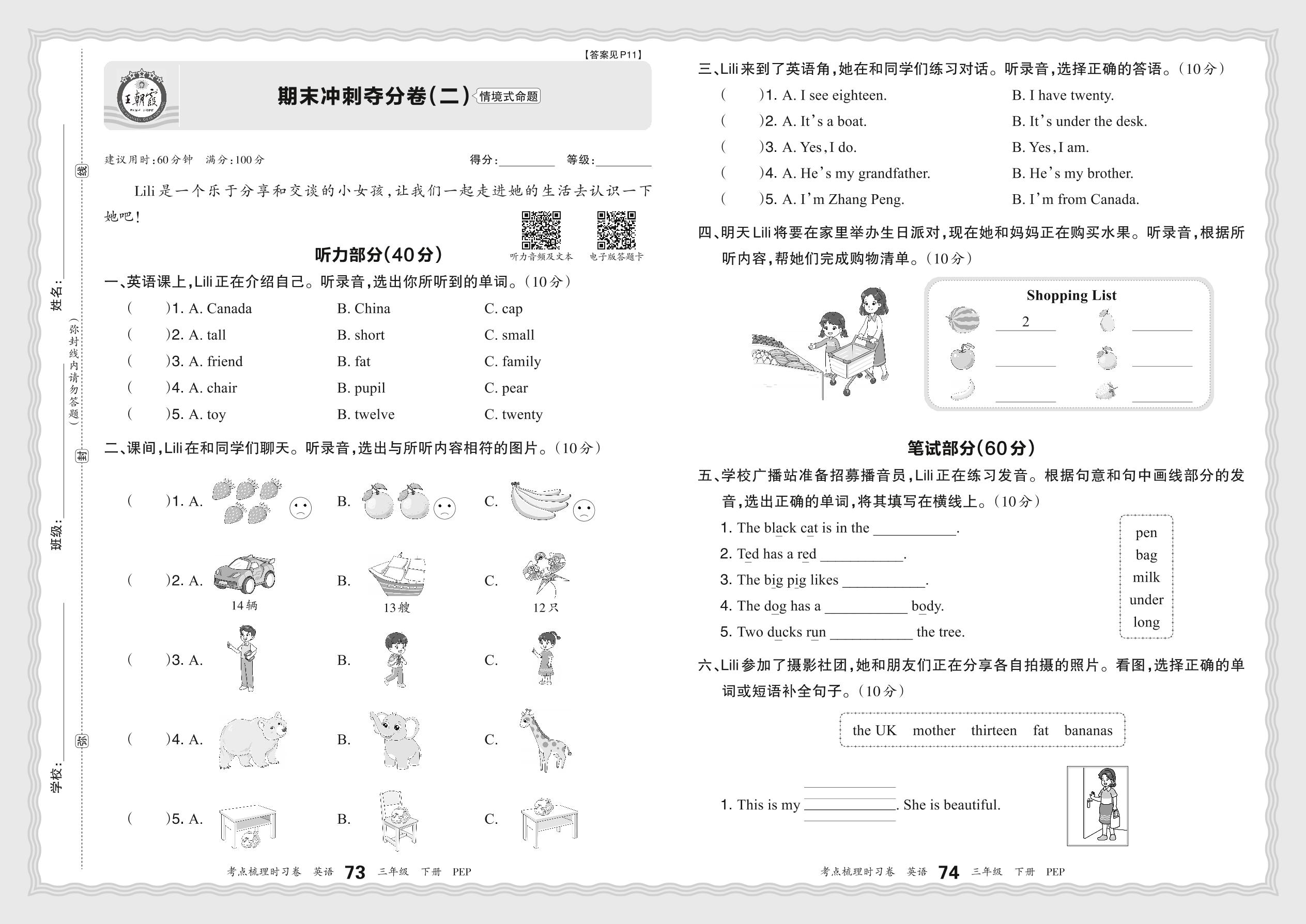 2024春下册三年级英语人教PEP版 期末冲刺夺分卷(二)