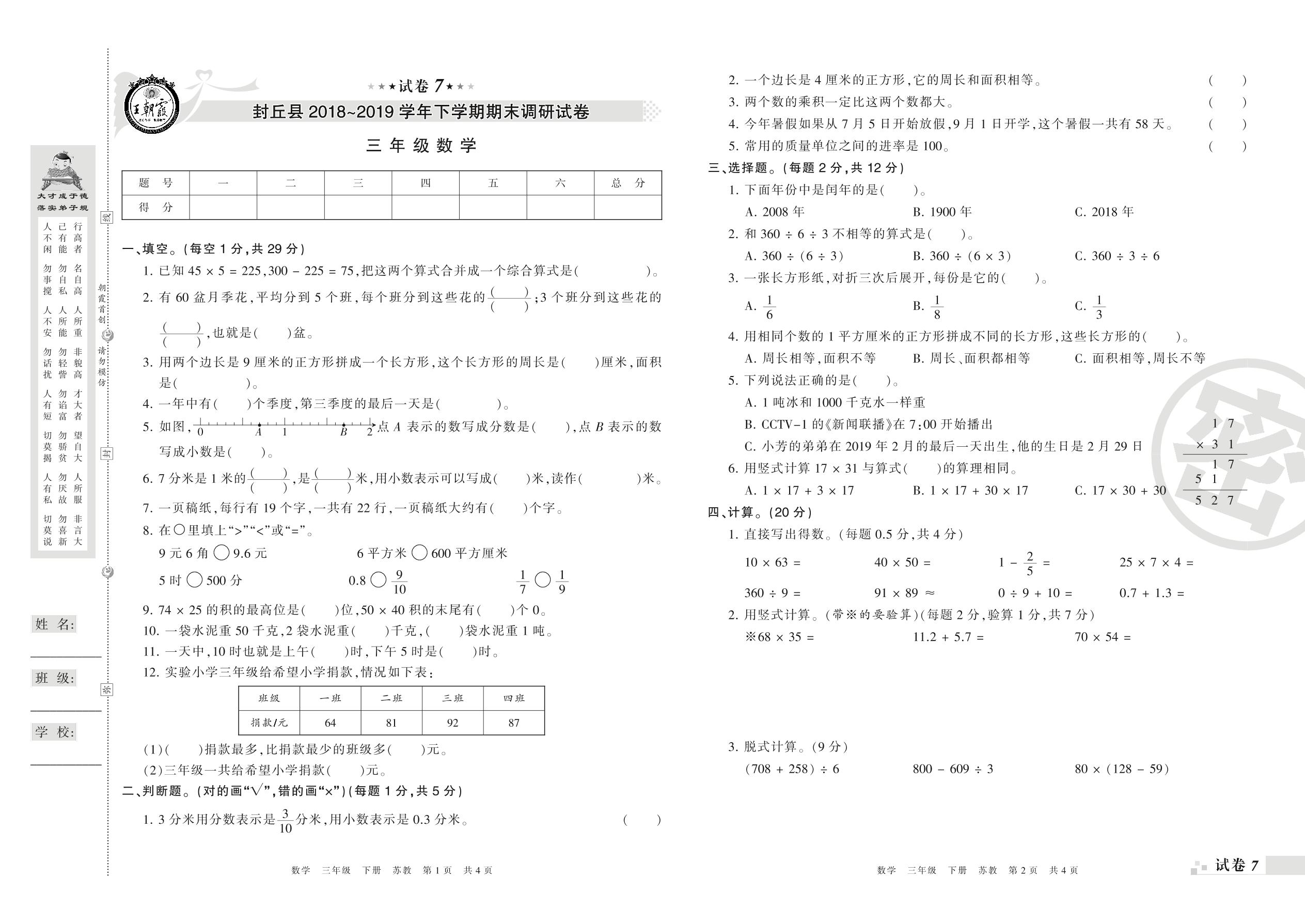 2018-2019学年第二学期新乡市封丘县三年级数学试卷(苏教版)【7】