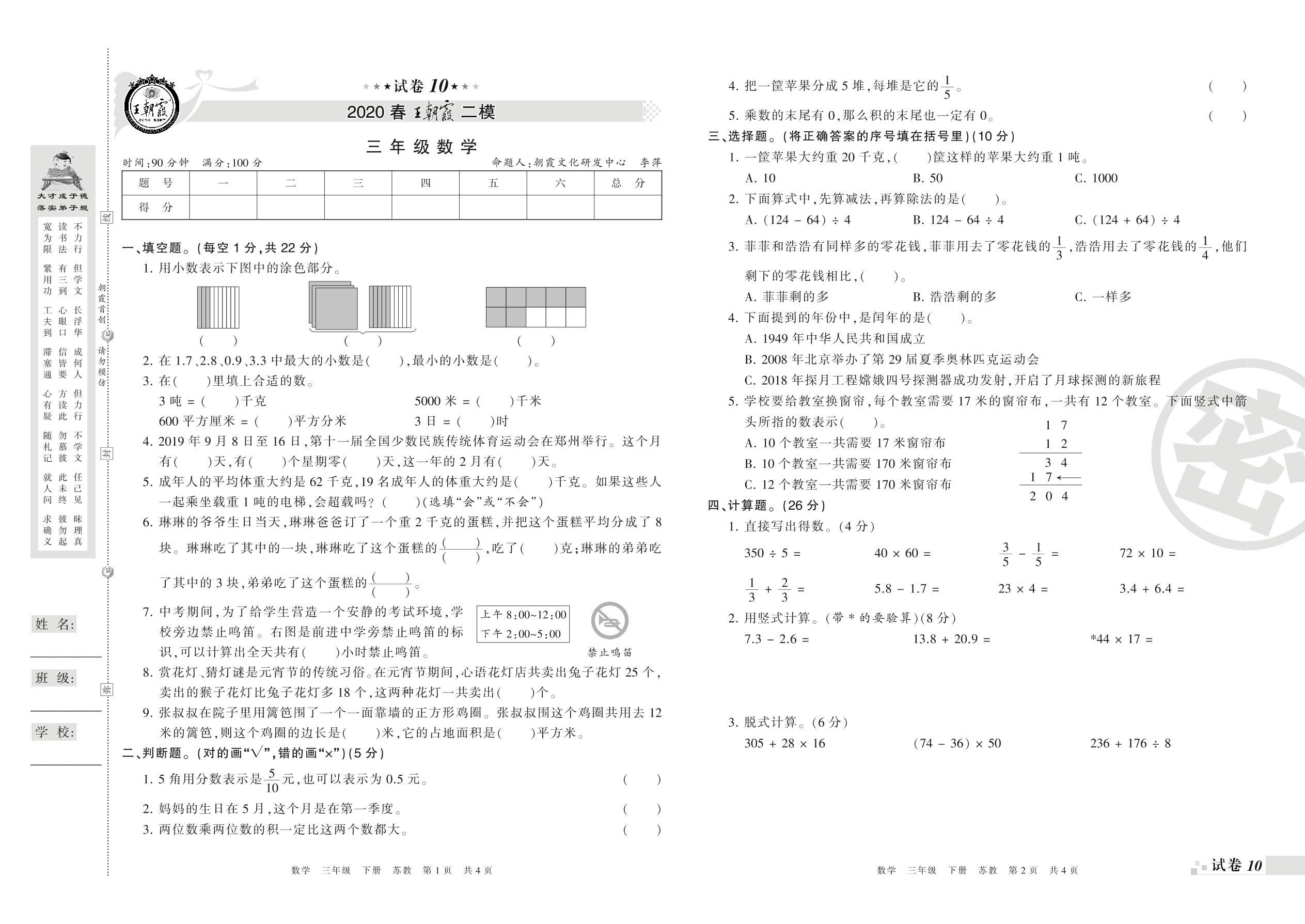 王朝霞期末模拟卷三年级下册数学(苏教版)_R21080494338【10】