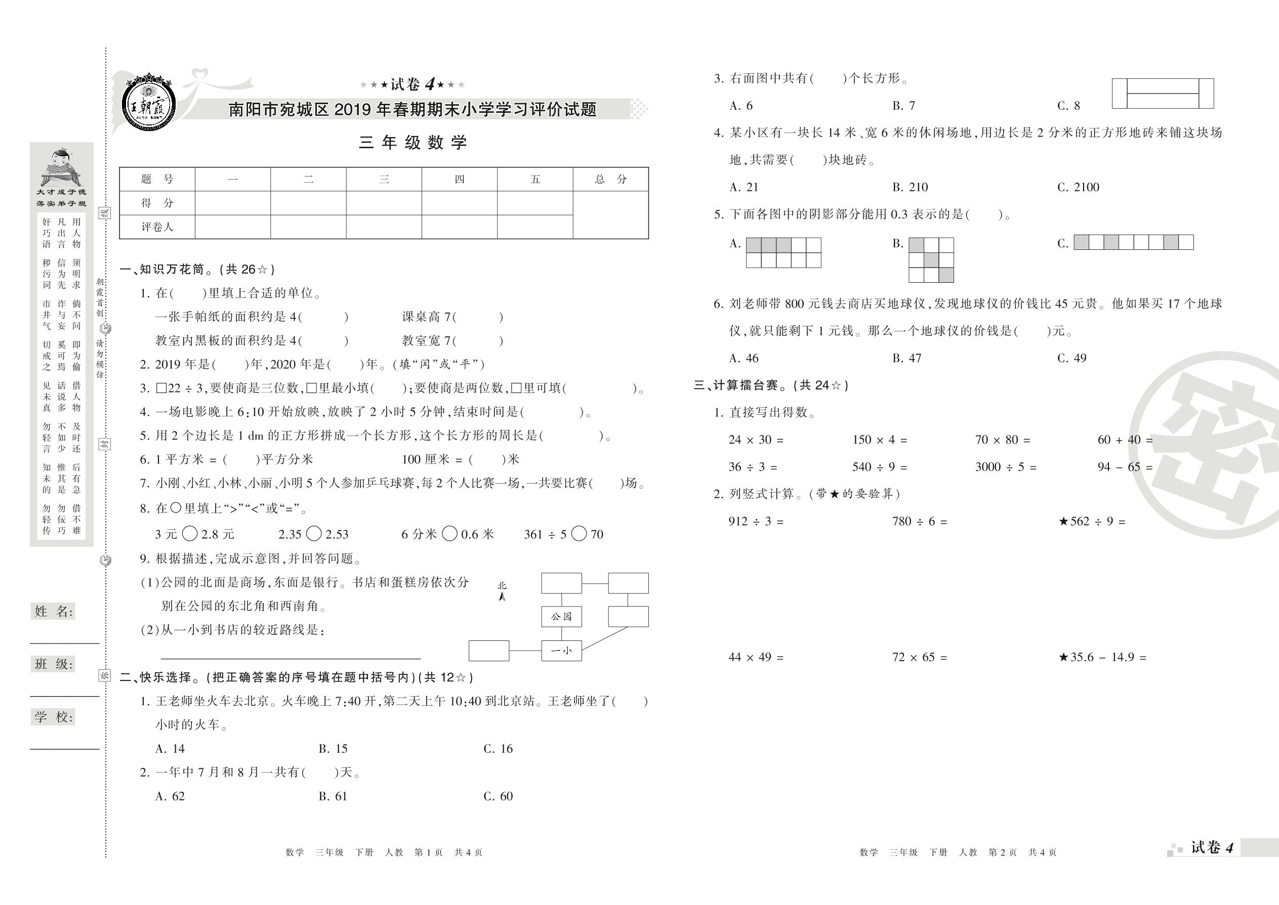 2018-2019学年第二学期南阳市宛城区三年级数学试卷(人教版)【4】