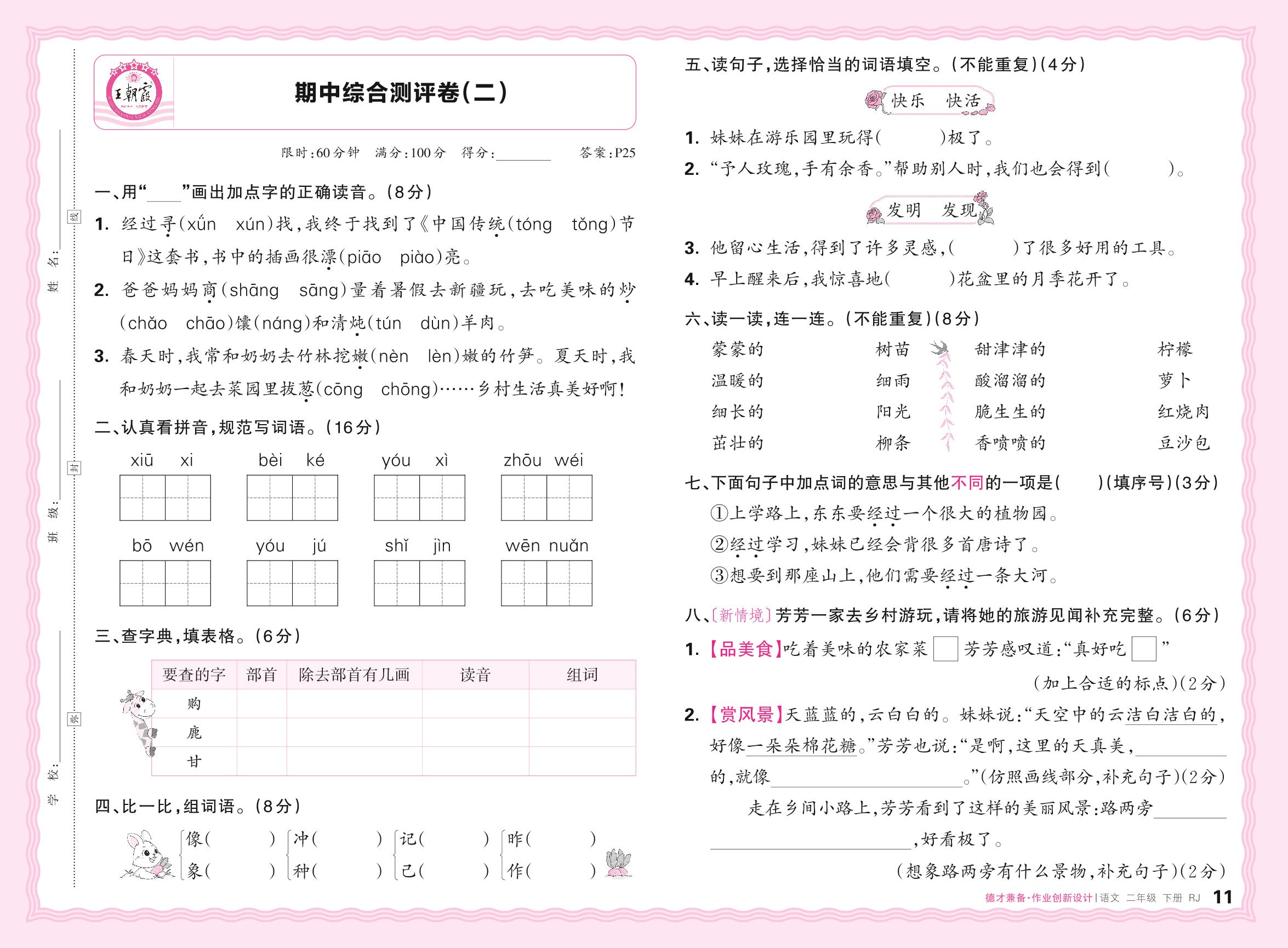 2024春下册二年级语文人教版 期中综合测评卷(二)