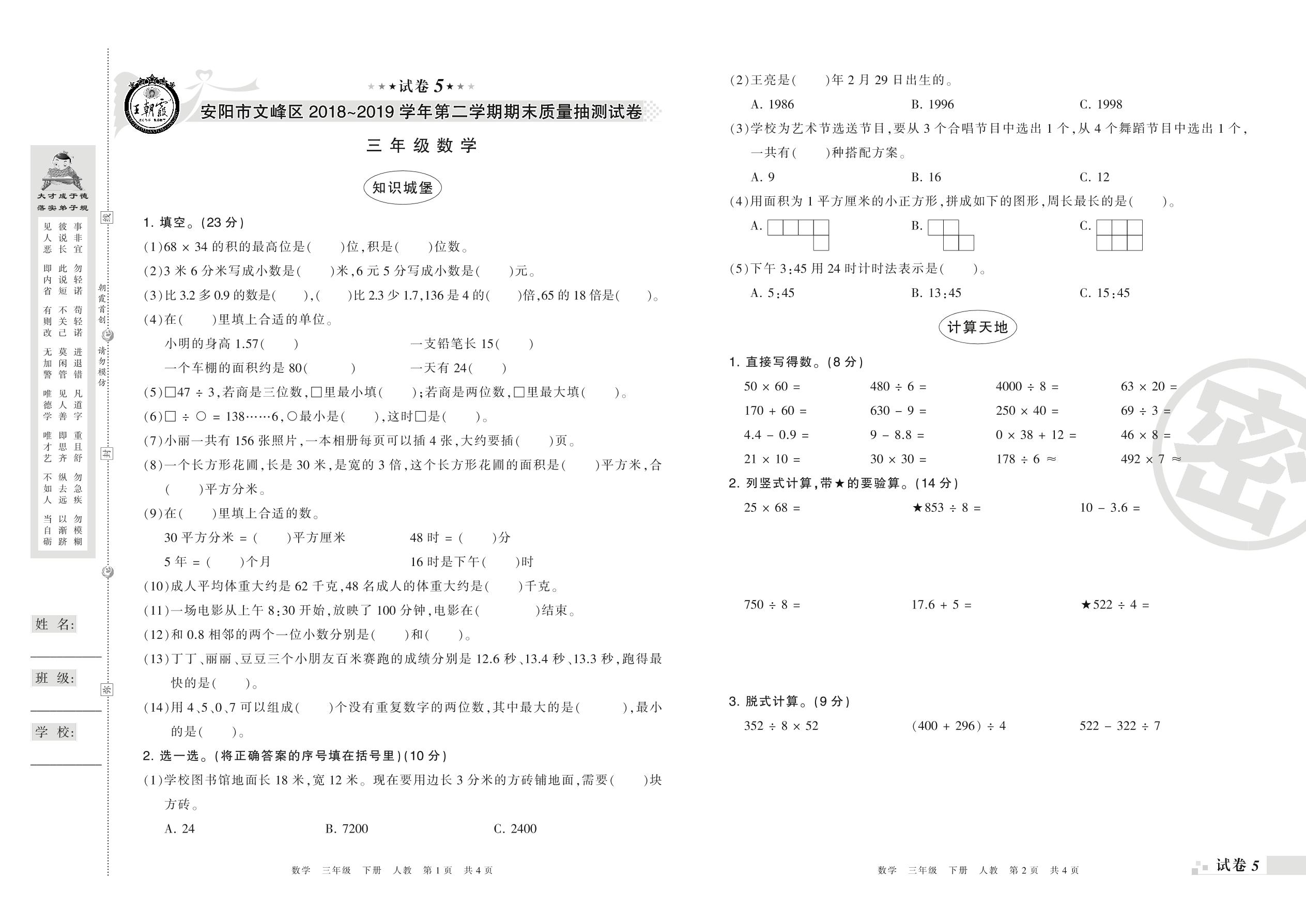 2018-2019学年第二学期安阳市文峰区三年级数学试卷(人教版)【5】
