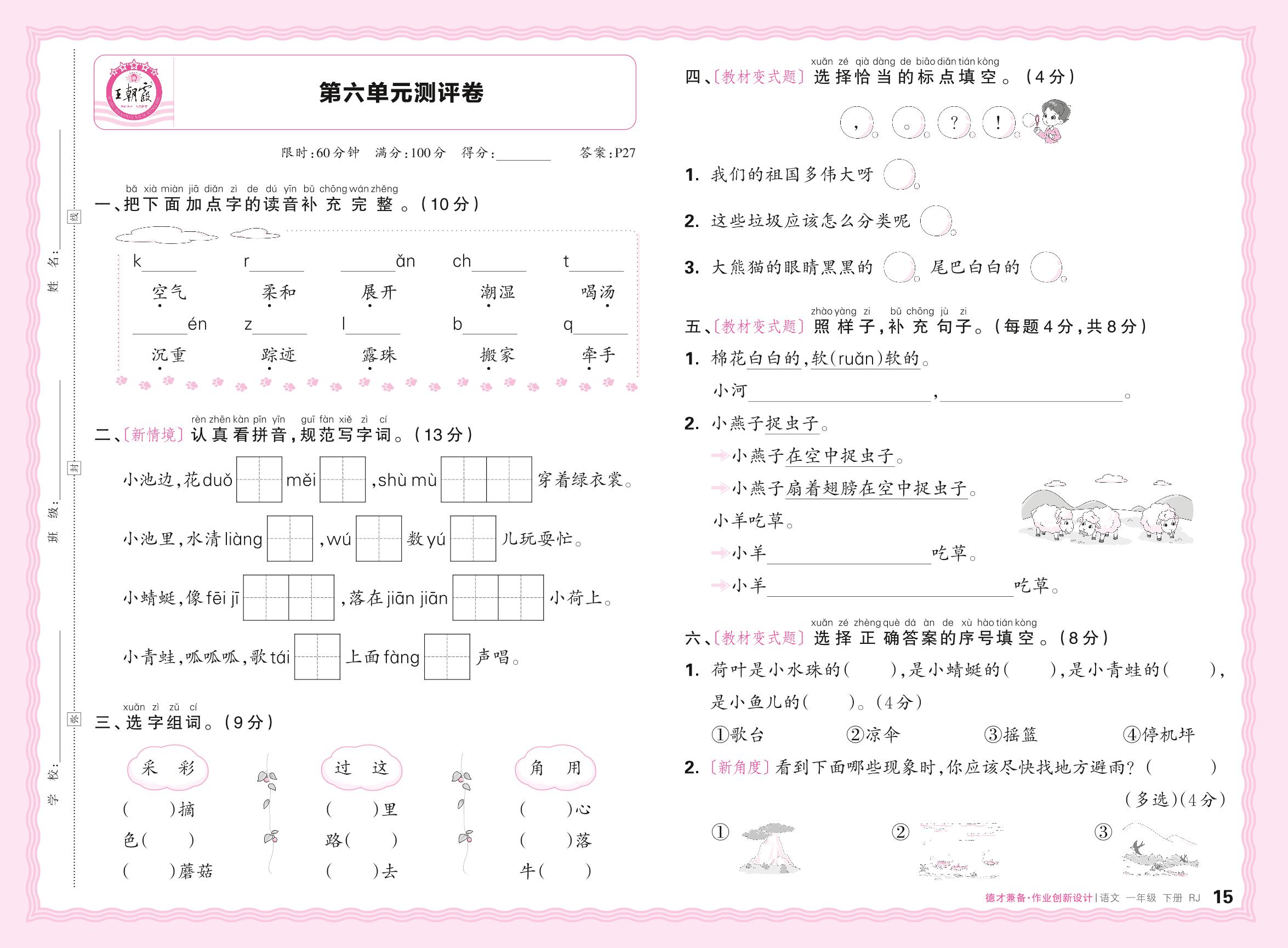 2024春下册一年级语文人教版 第六单元测评卷