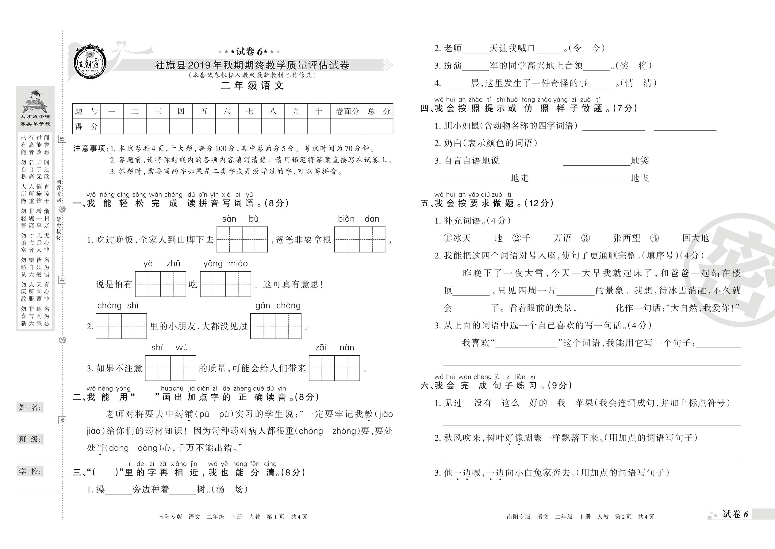 2019-2020学年第一学期南阳市社旗县二年级语文试卷(人教版)【6】