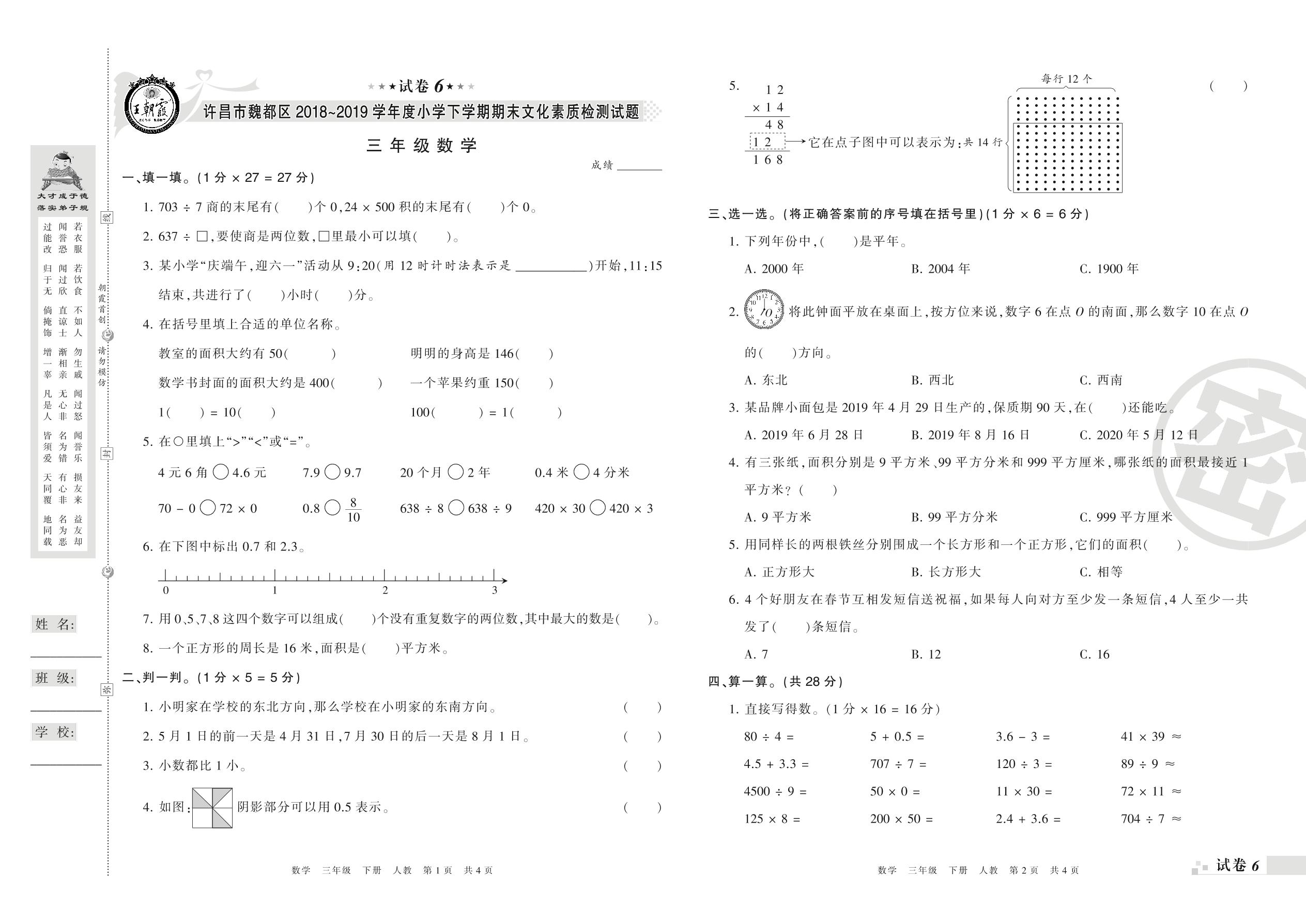 2018-2019学年第二学期许昌市魏都区三年级数学试卷(人教版)【6】