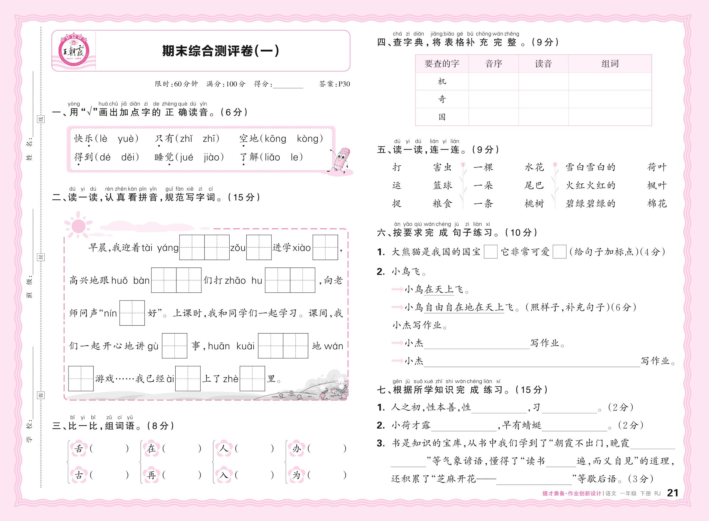 2024春下册一年级语文人教版 期末综合测评卷(一)