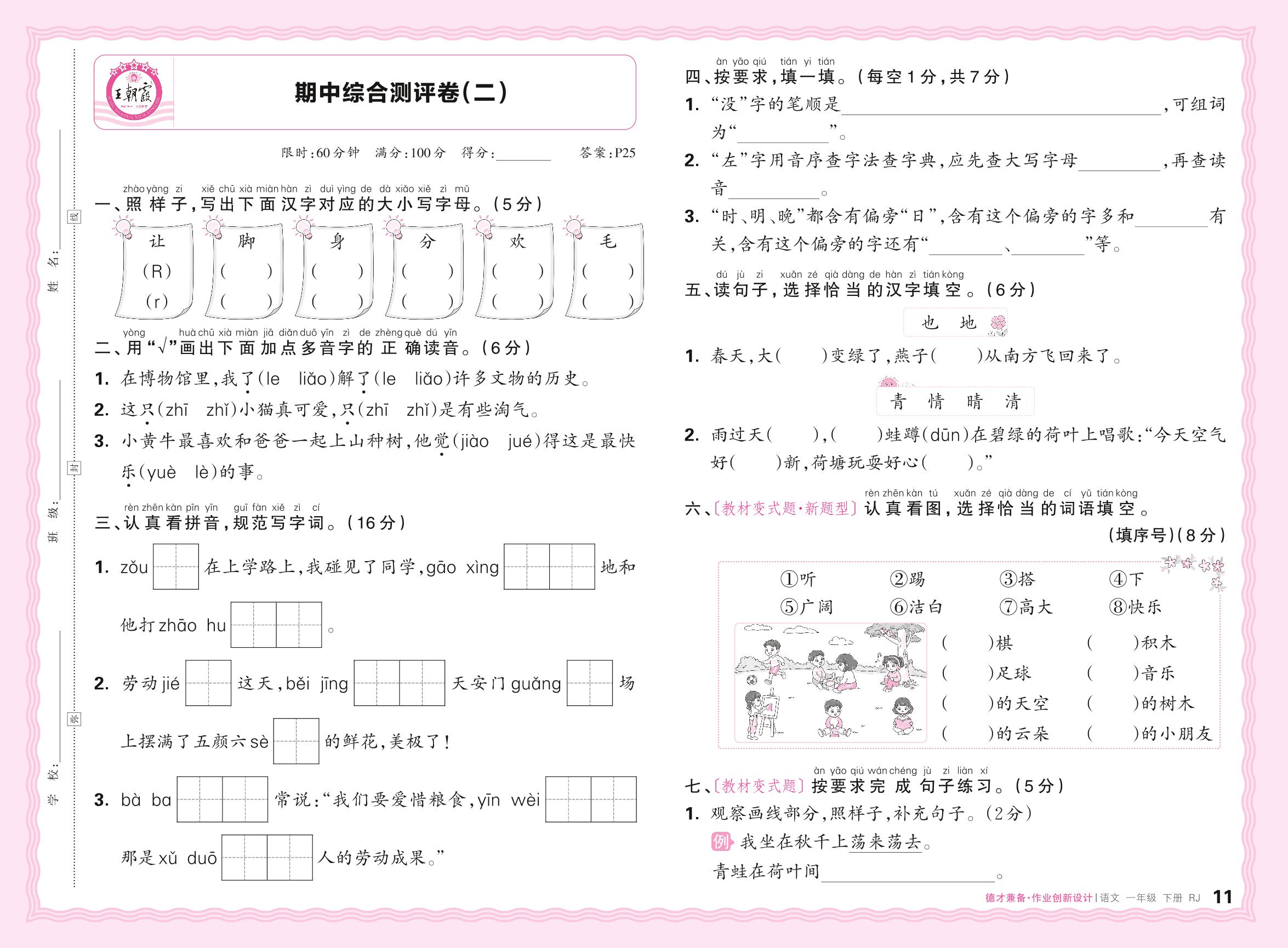 2024春下册一年级语文人教版 期中综合测评卷(二)