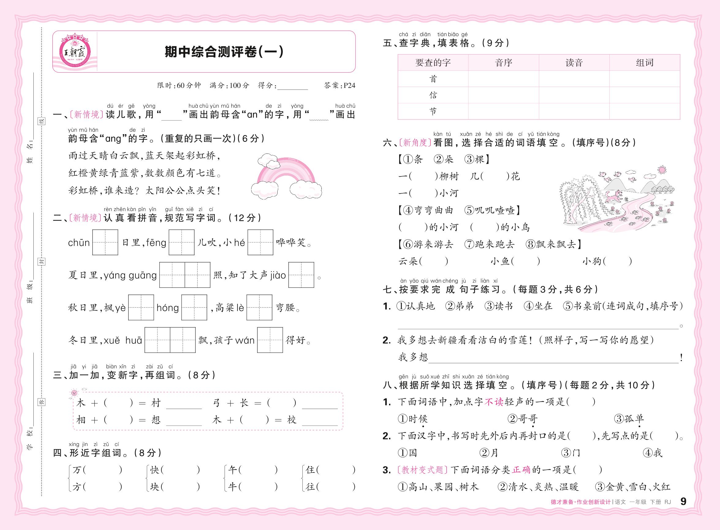 2024春下册一年级语文人教版 期中综合测评卷(一)