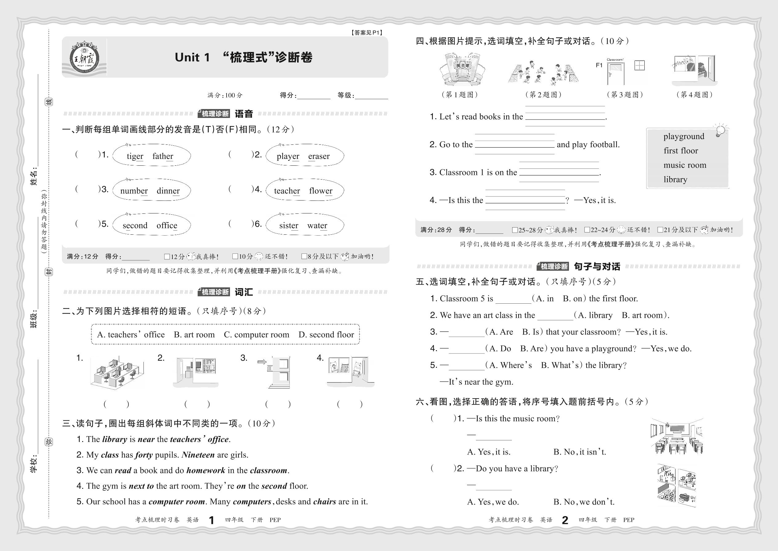 2024春下册四年级英语人教PEP版 Unit 1 “梳理式”诊断卷
