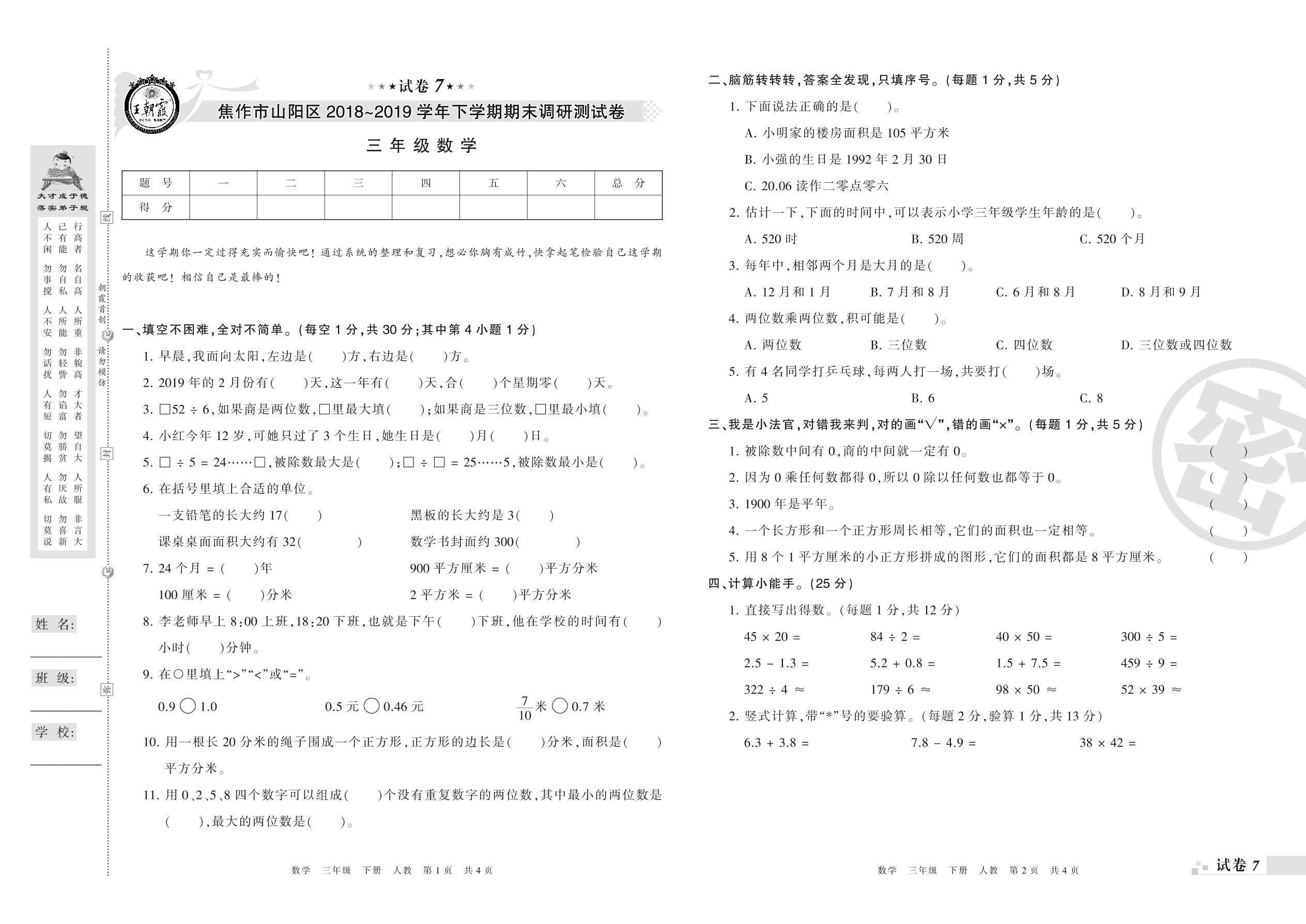 2018-2019学年第二学期焦作市山阳区三年级数学试卷(人教版)【7】