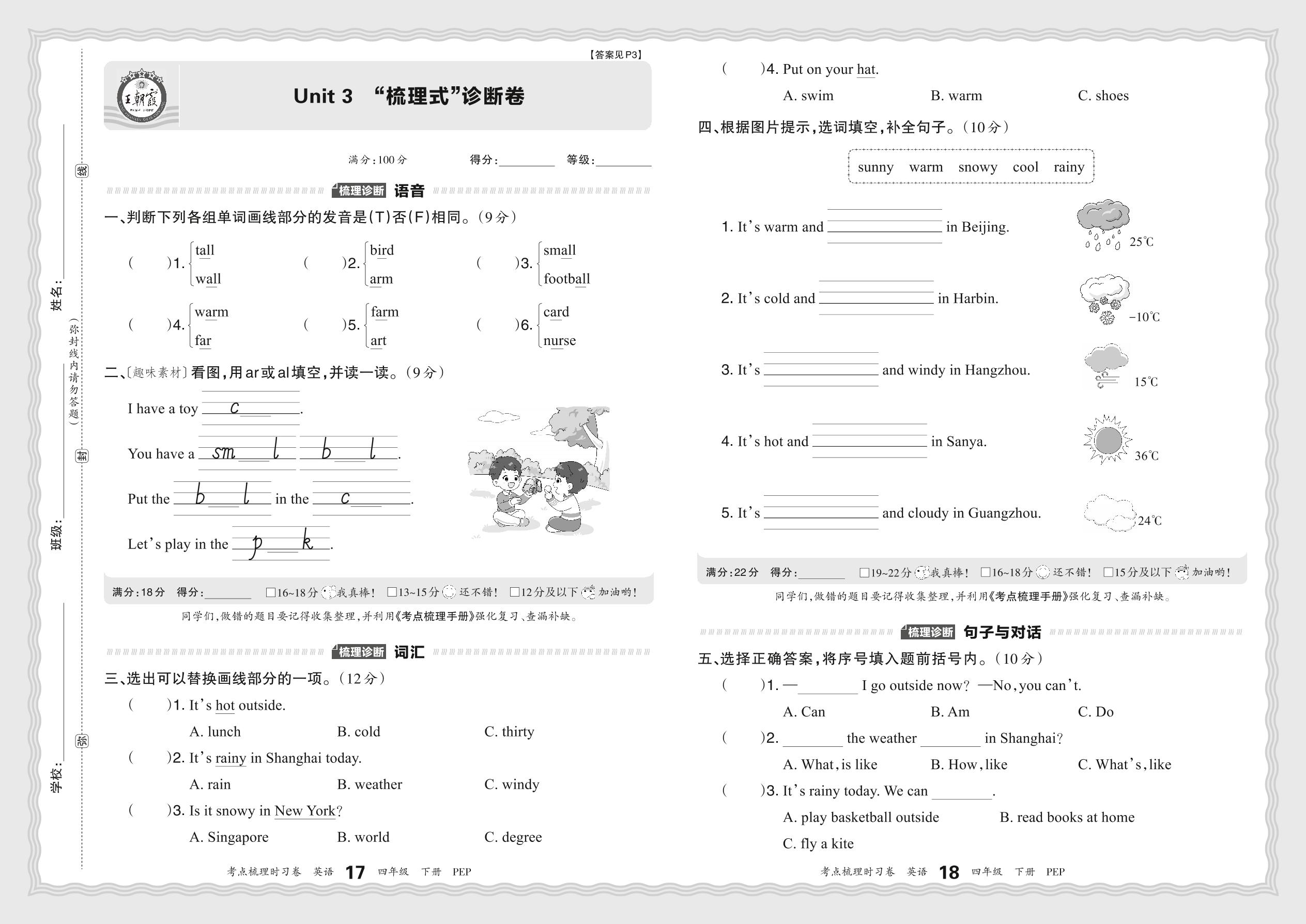 2024春下册四年级英语人教PEP版 Unit 3 “梳理式”诊断卷