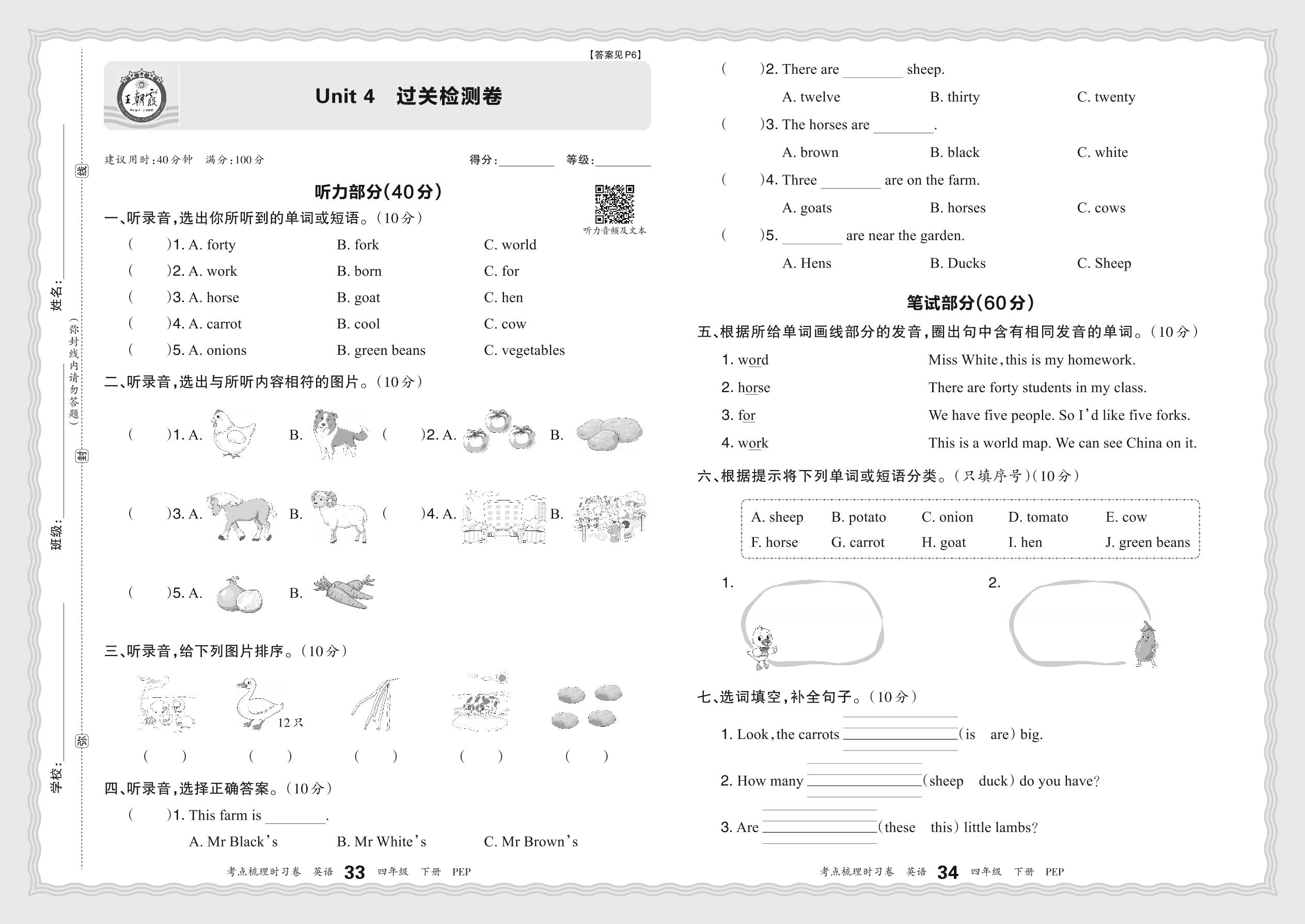 2024春下册四年级英语人教PEP版 Unit 4 过关检测卷
