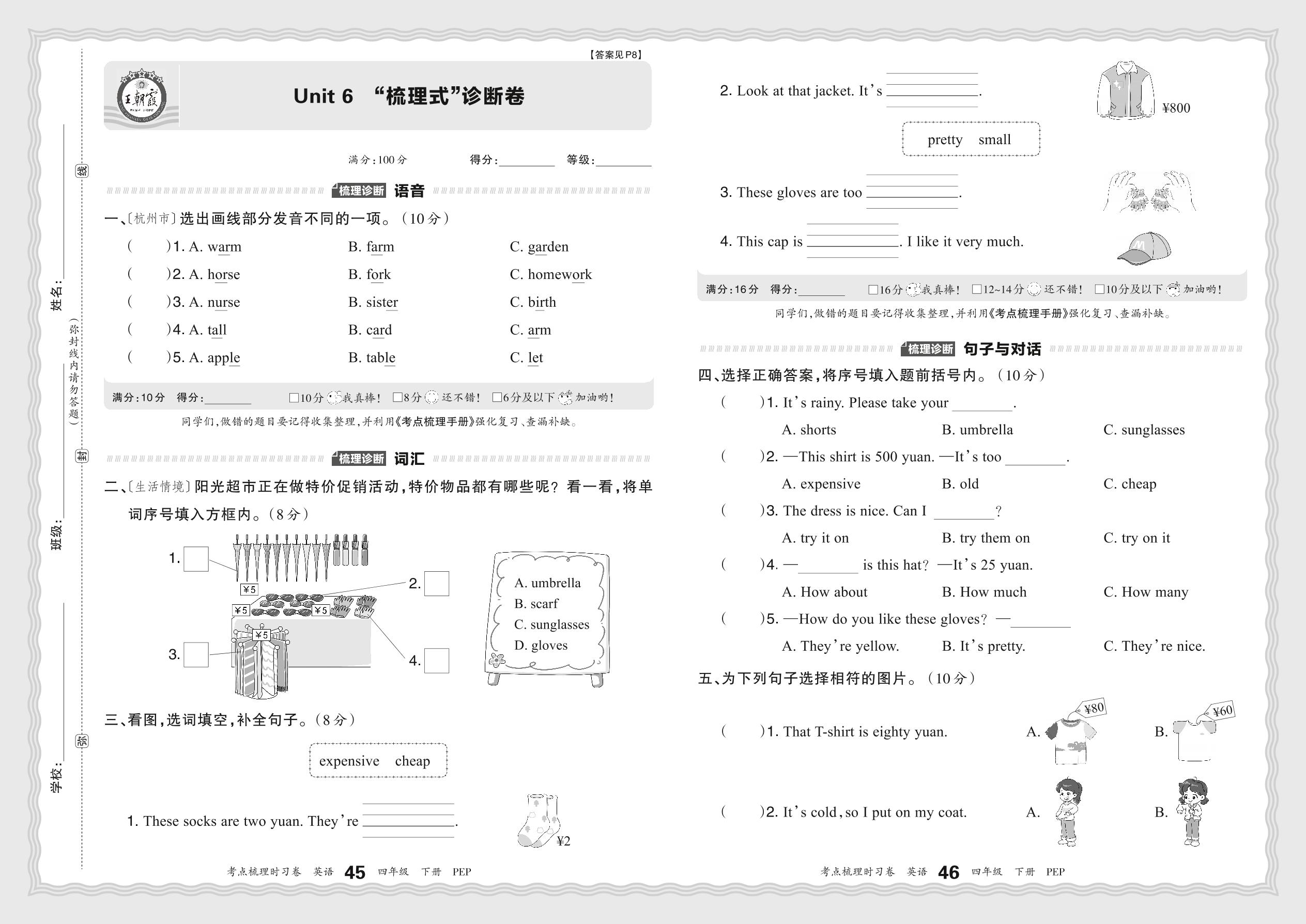 2024春下册四年级英语人教PEP版 Unit 6 “梳理式”诊断卷