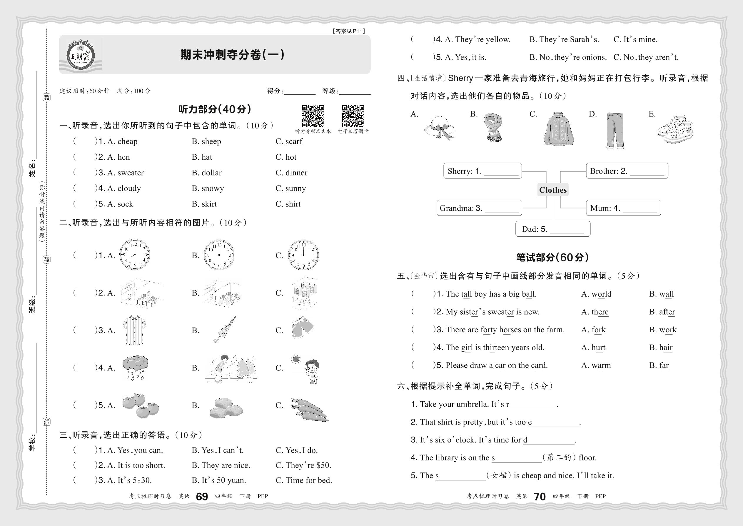 四年级英语人教PEP版(三起始)下册期末卷