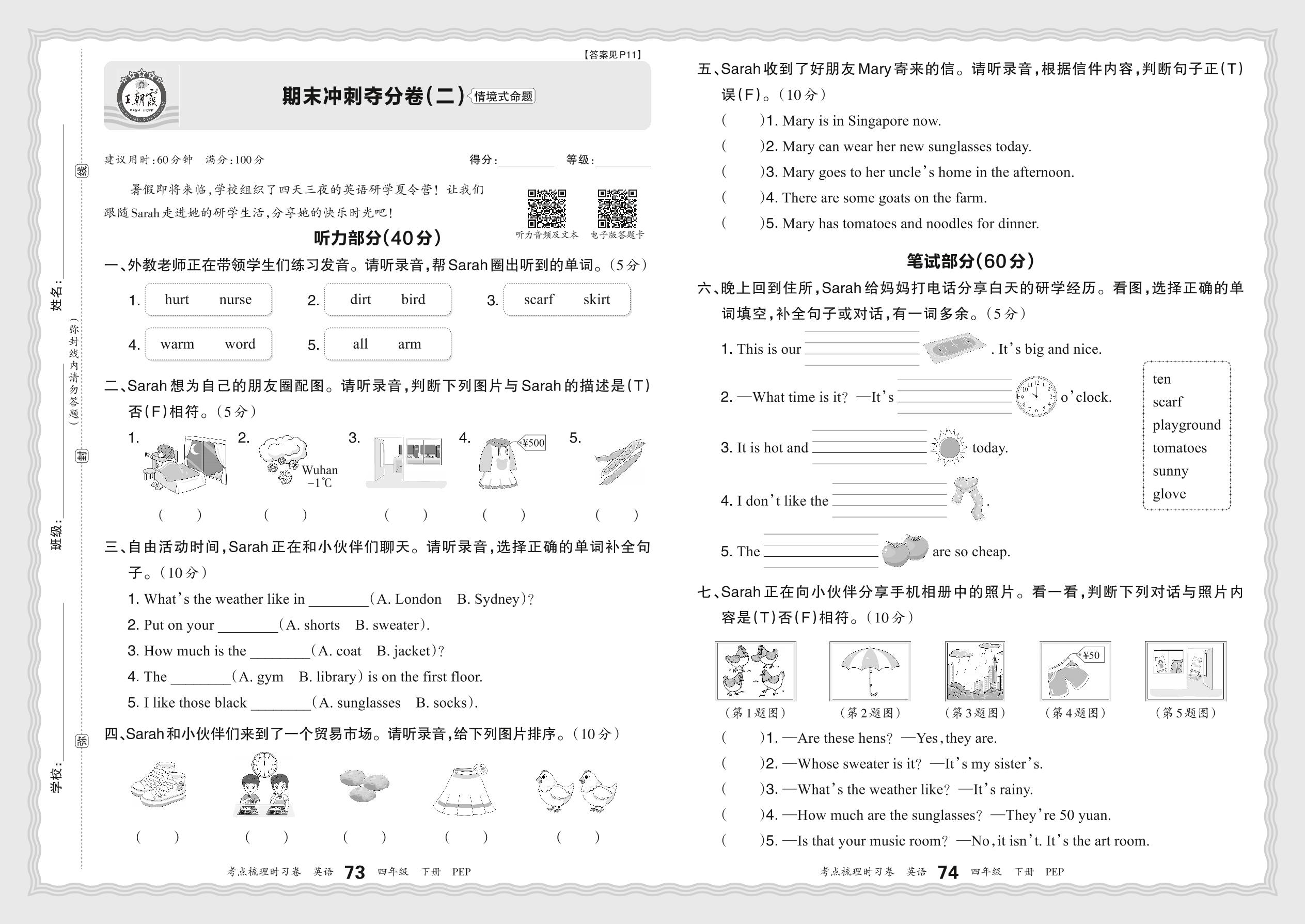 四年级英语人教PEP版(三起始)下册期末卷