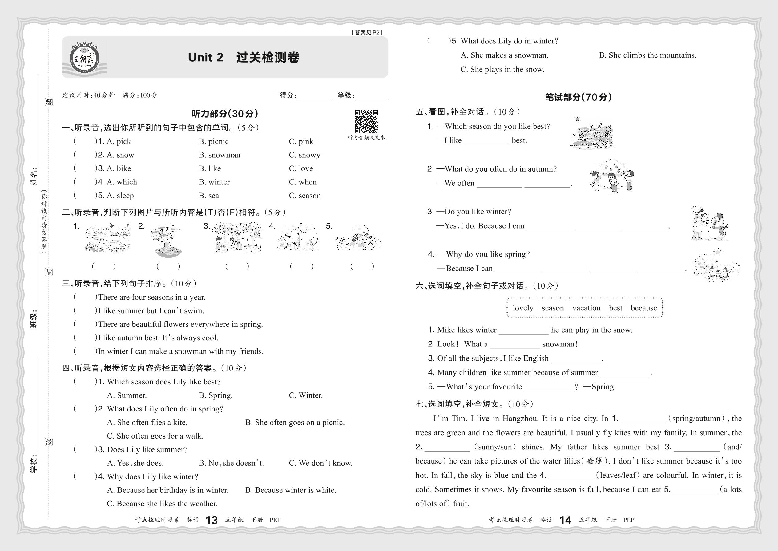 2024春下册五年级英语人教PEP版 Unit 2 过关检测卷