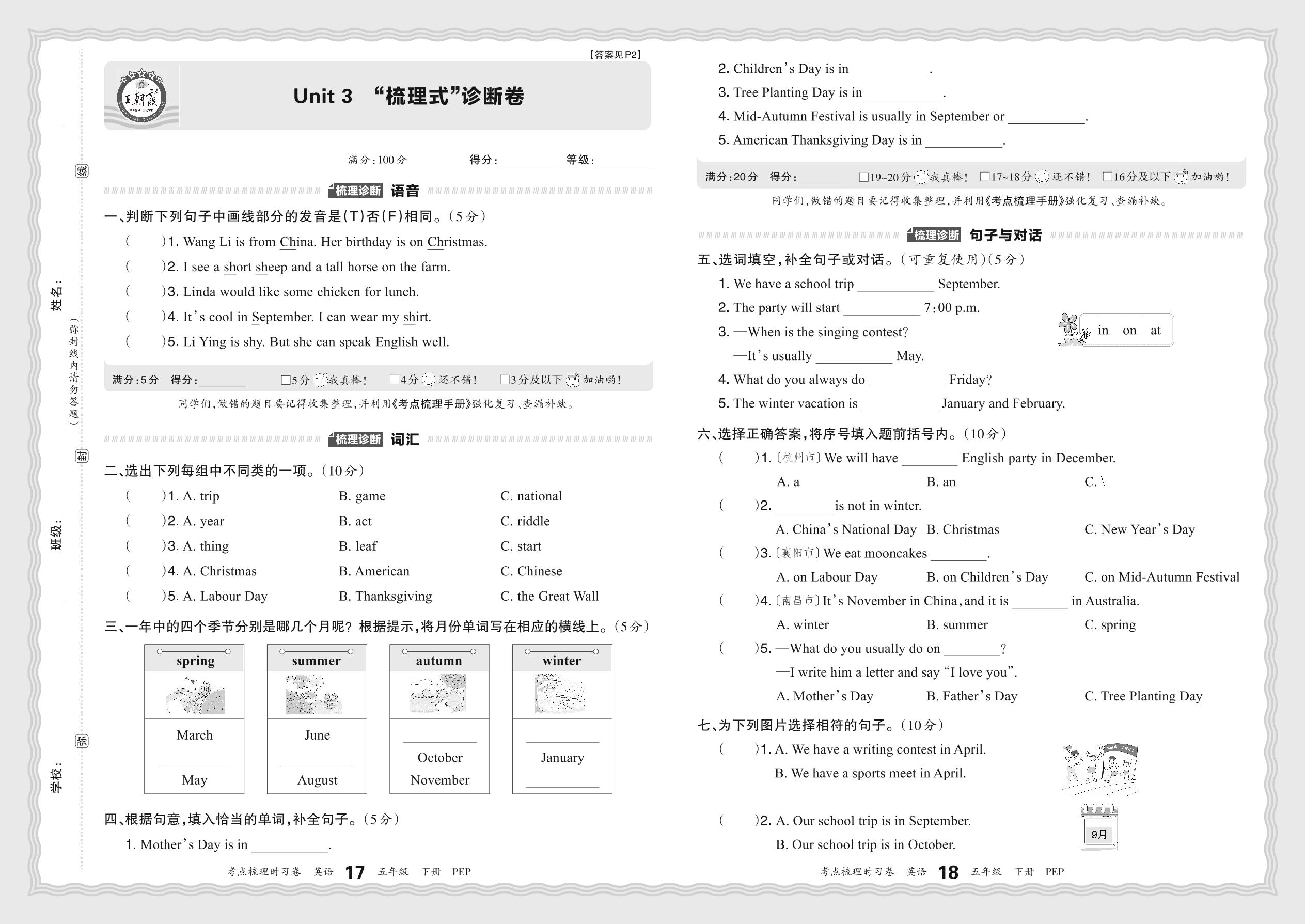五年级英语人教PEP版(三起始)下册单元卷