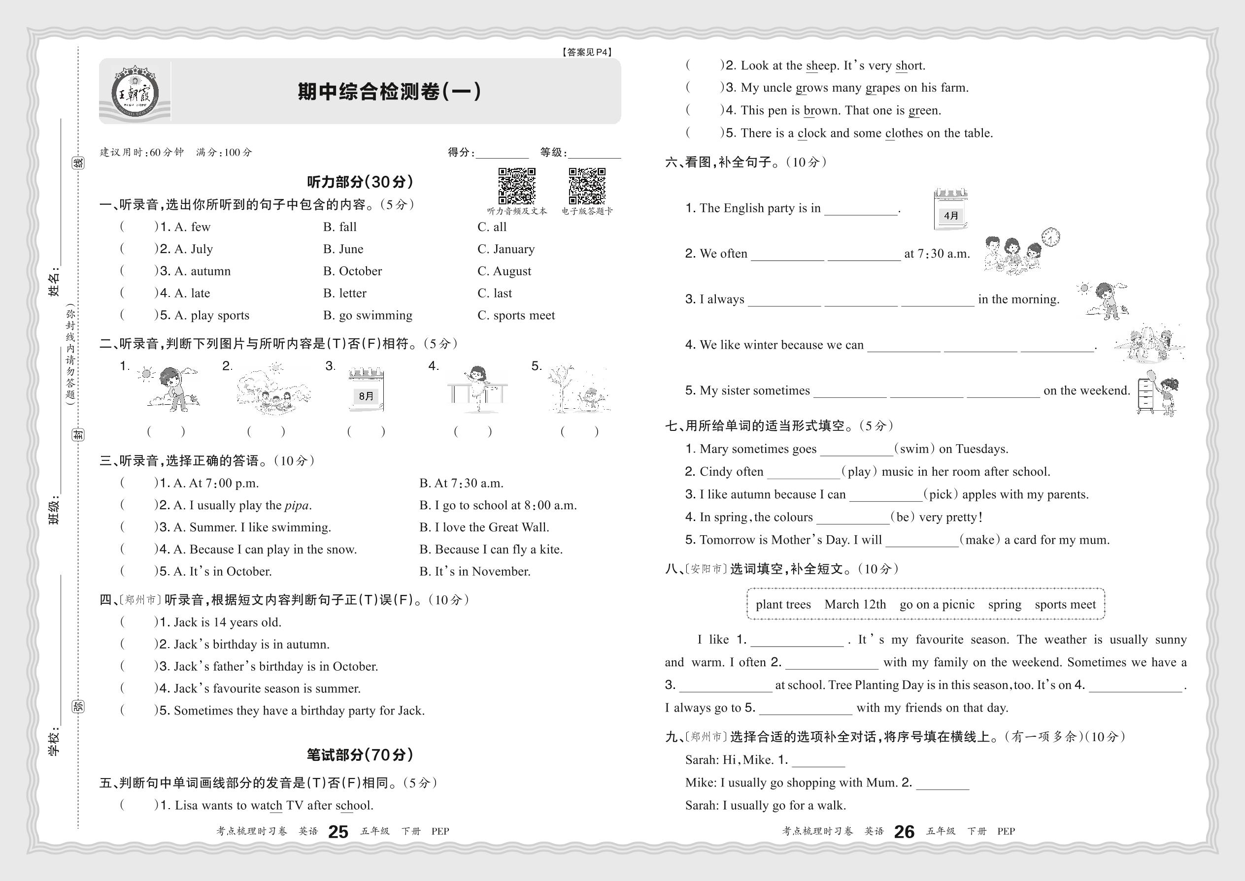 2024春下册五年级英语人教PEP版 期中综合检测卷(一)