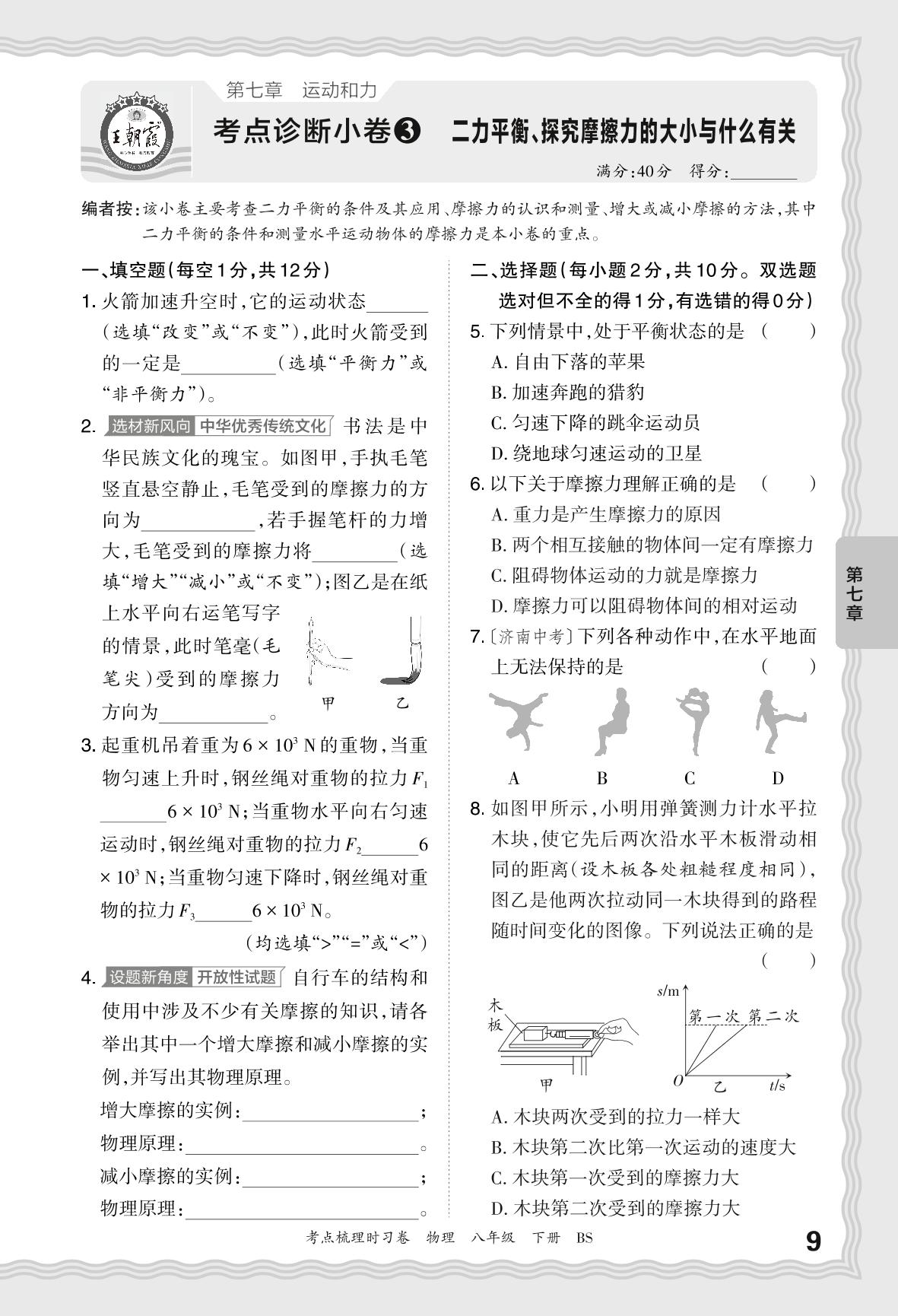2024春下册八年级物理北师版 第七章 考点诊断小卷3 二力平衡、探究摩擦力的大小与什么有关