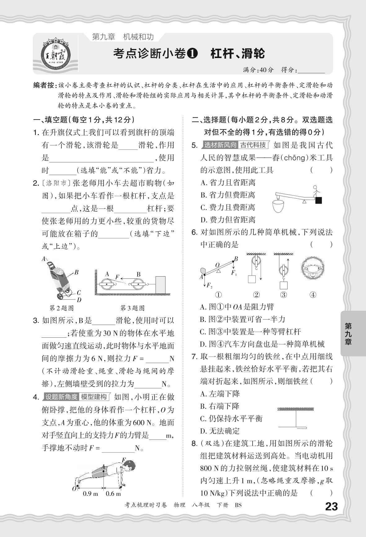 2024春下册八年级物理北师版 第九章 考点诊断小卷1 杠杆、滑轮