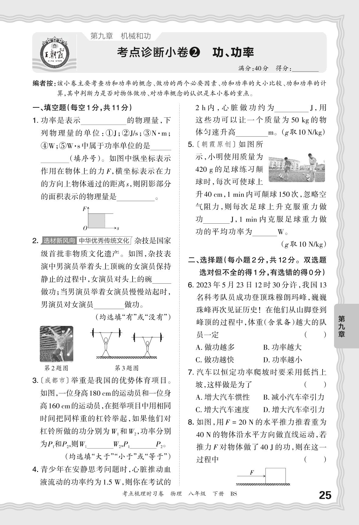 2024春下册八年级物理北师版 第九章 考点诊断小卷2 功、功率