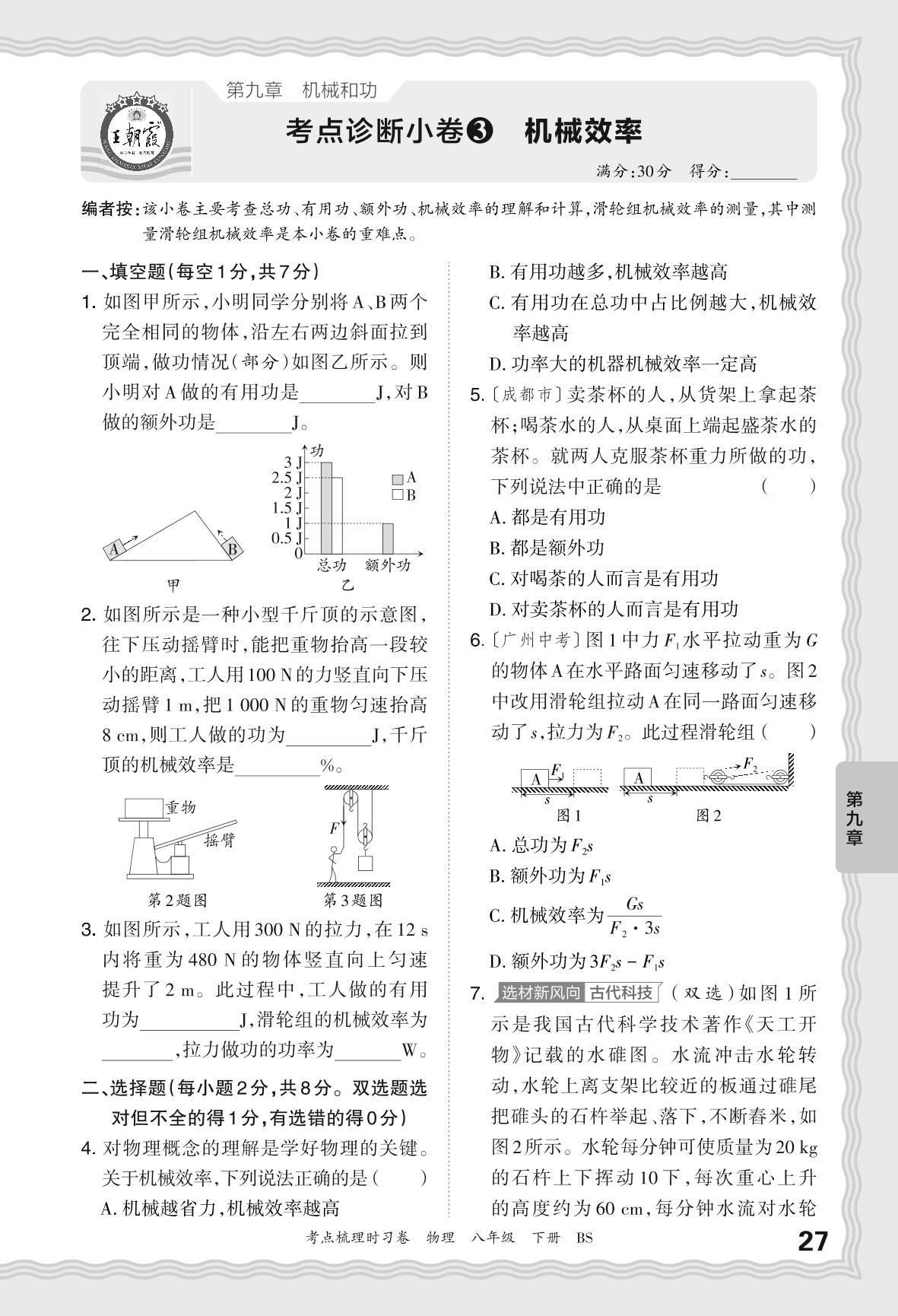 2024春下册八年级物理北师版 第九章 考点诊断小卷3 机械效率