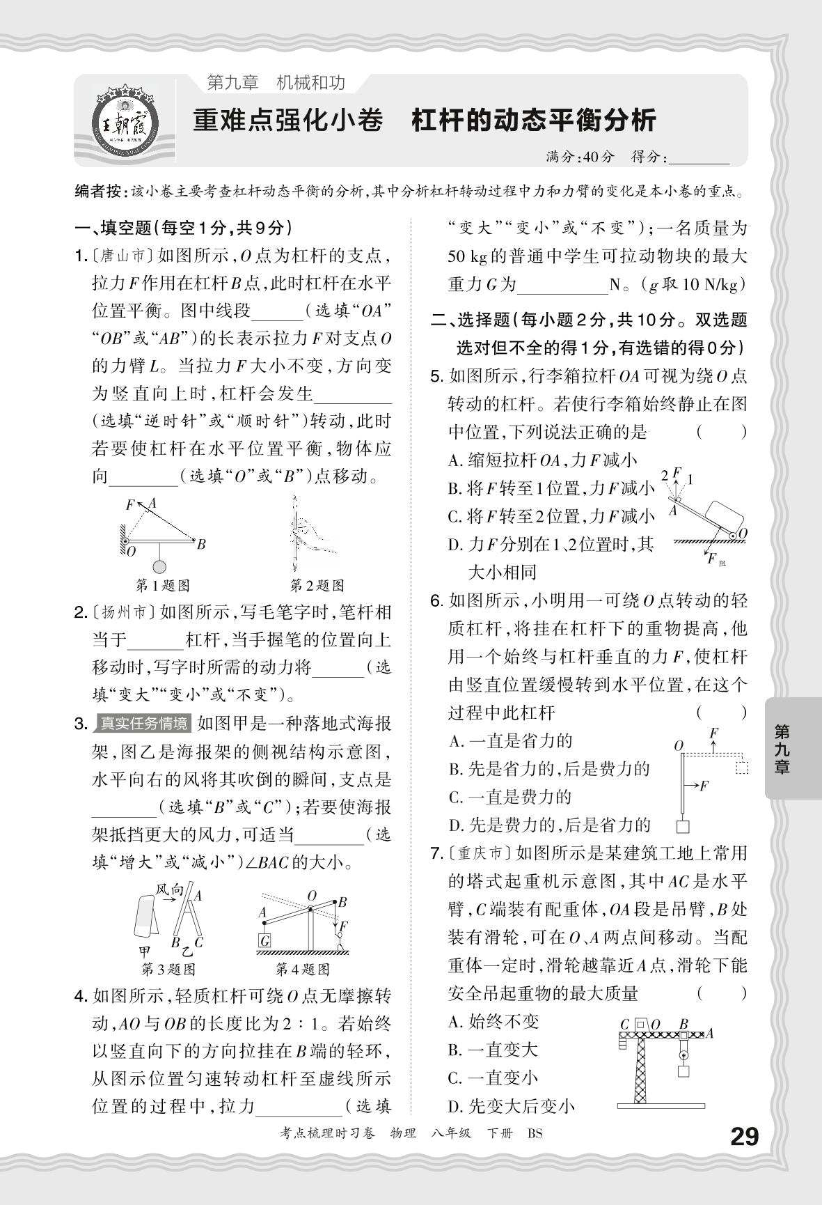 2024春下册八年级物理北师版 第九章 重难点强化小卷 杠杆的动态平衡分析