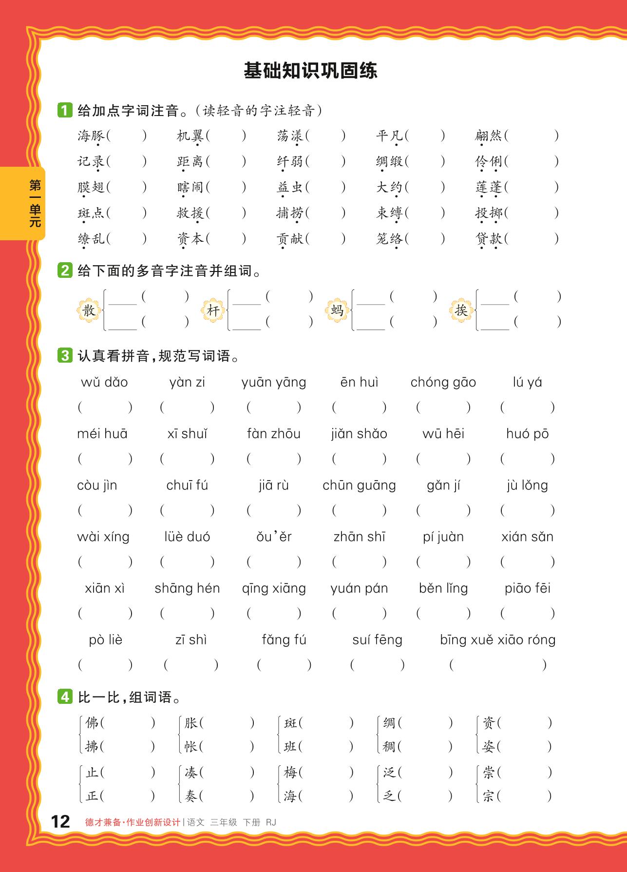 2024春下册三年级语文人教版 第一单元 可爱的生灵——基础知识巩固练