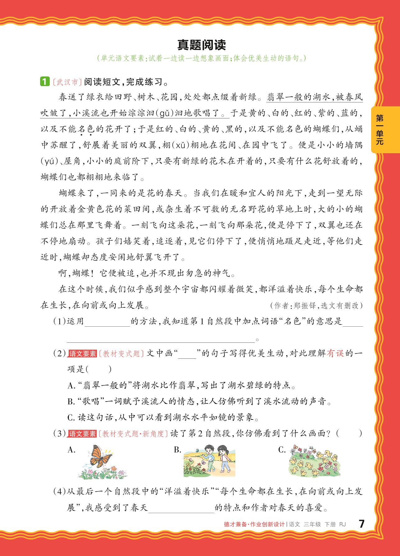2024春下册三年级语文人教版 第一单元 可爱的生灵——真题阅读