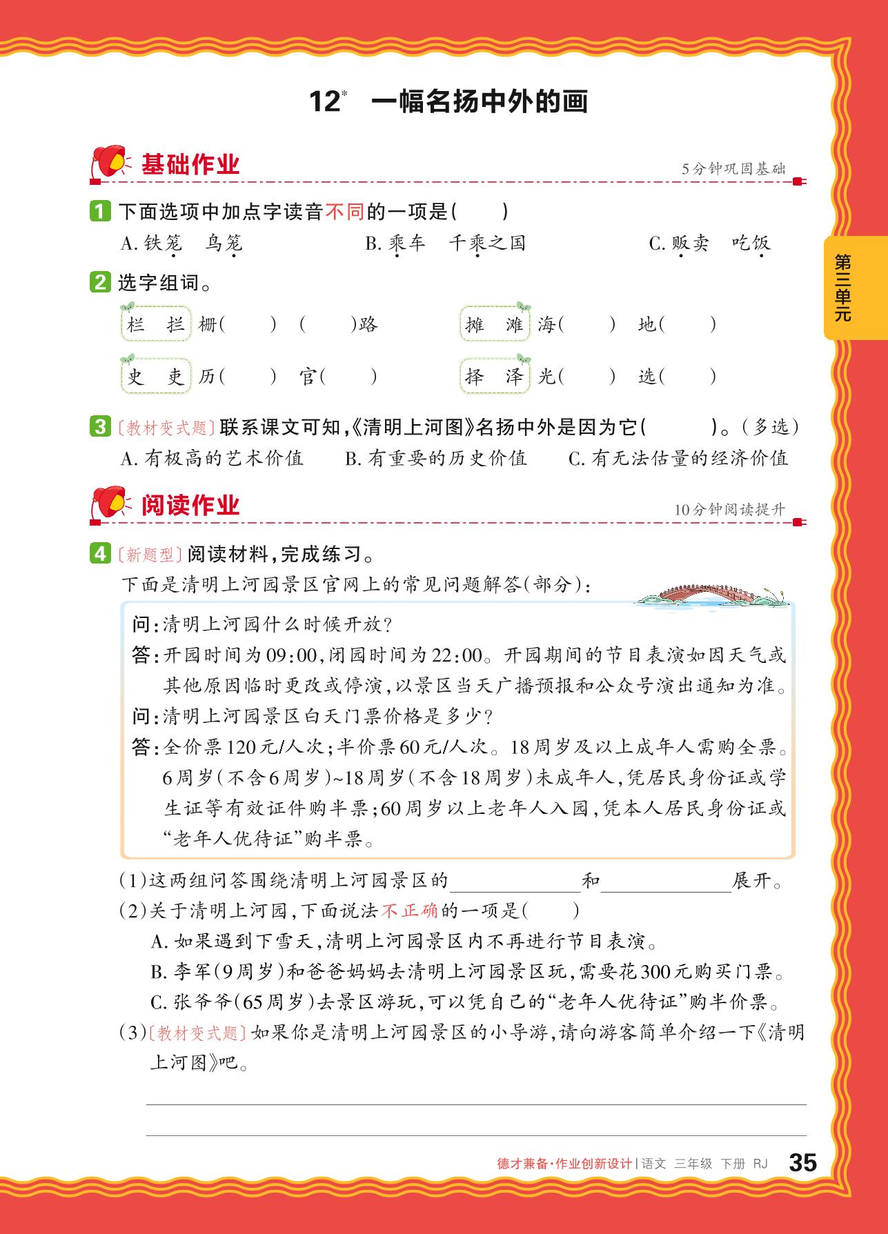 2024春下册三年级语文人教版 第三单元 中华优秀传统文化——12. 一幅名扬中外的画