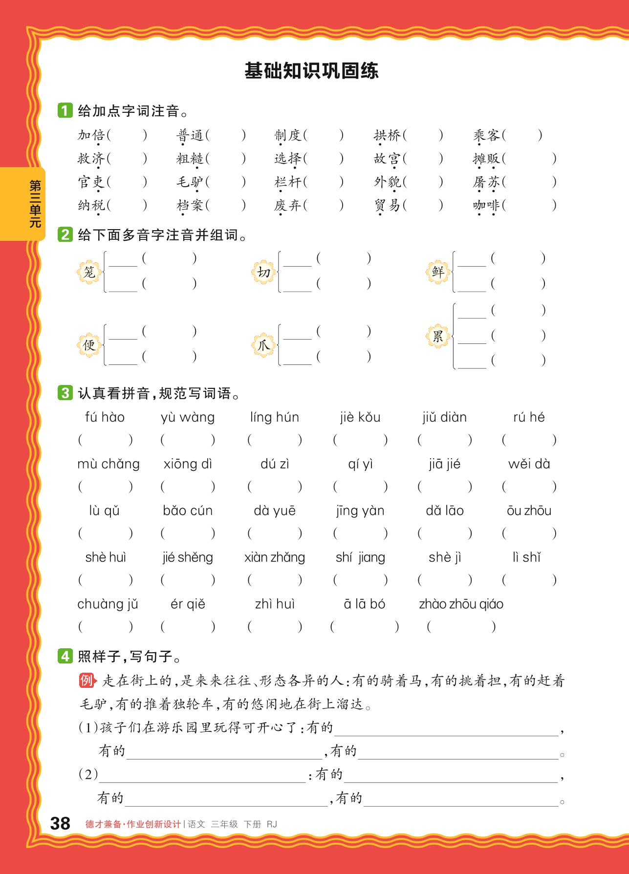 2024春下册三年级语文人教版 第三单元 中华优秀传统文化——基础知识巩固练