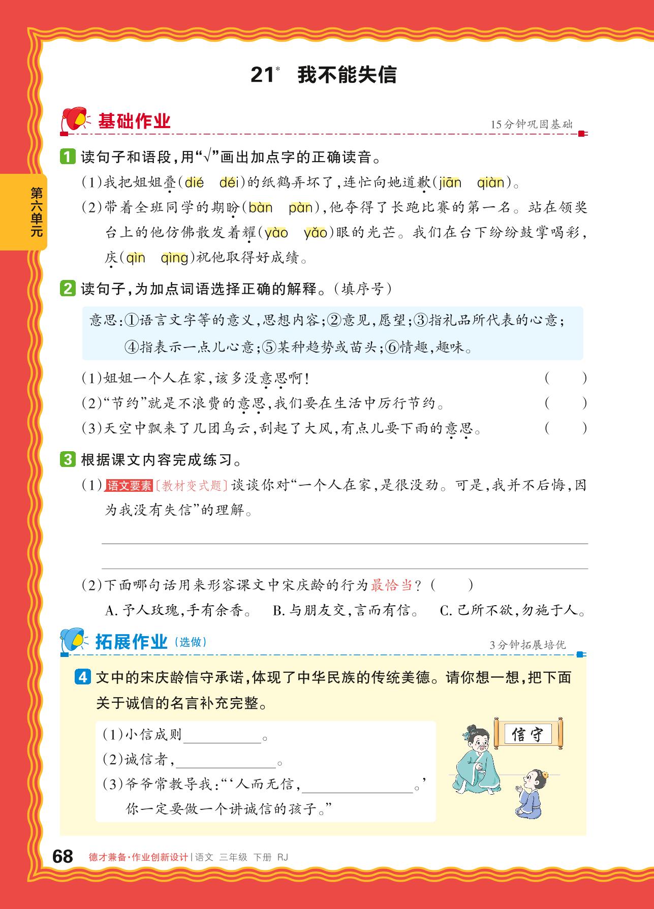 2024春下册三年级语文人教版 第六单元 多彩童年——21. 我不能失信