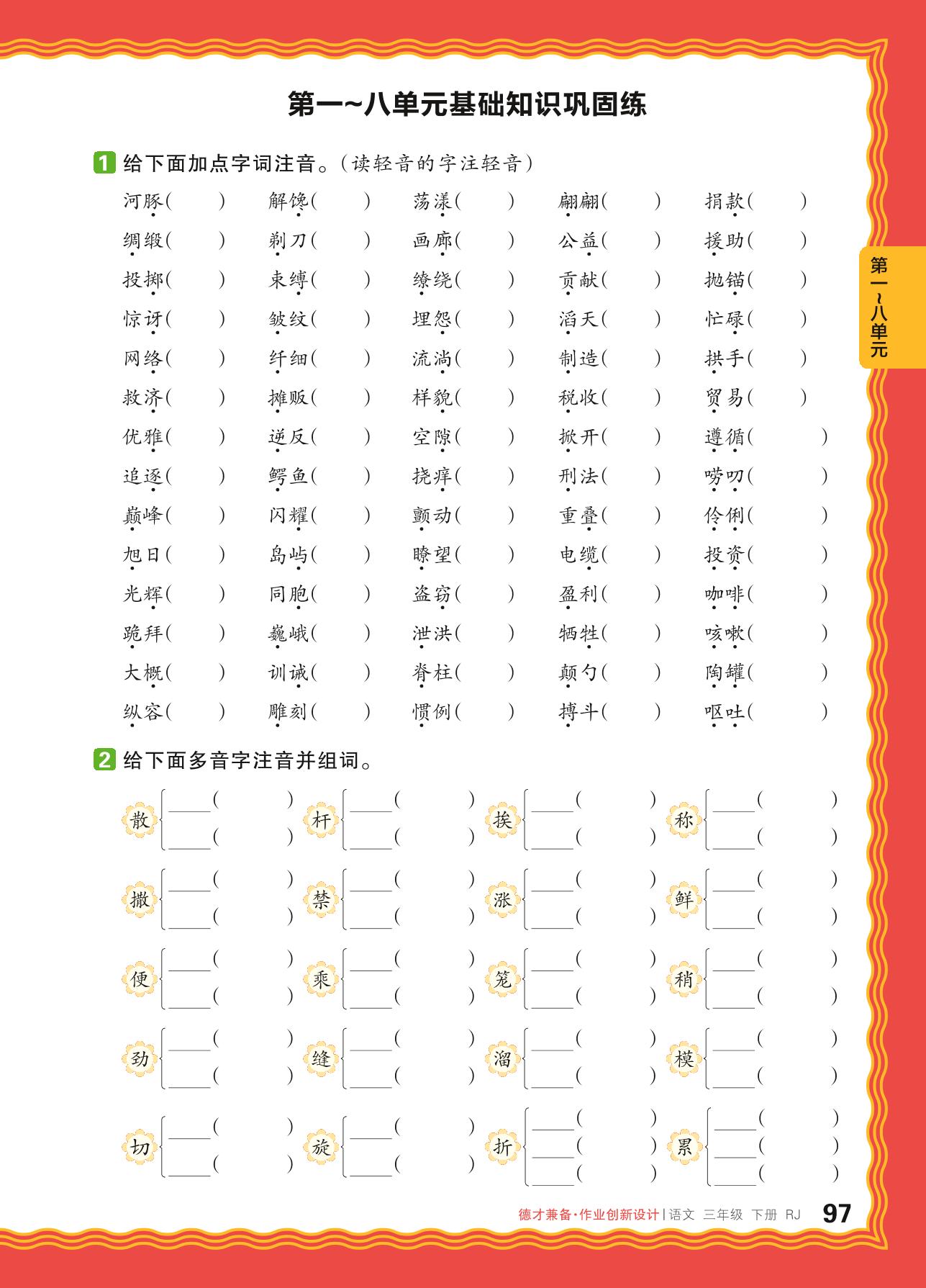 2024春下册三年级语文人教版 第一~八单元基础知识巩固练