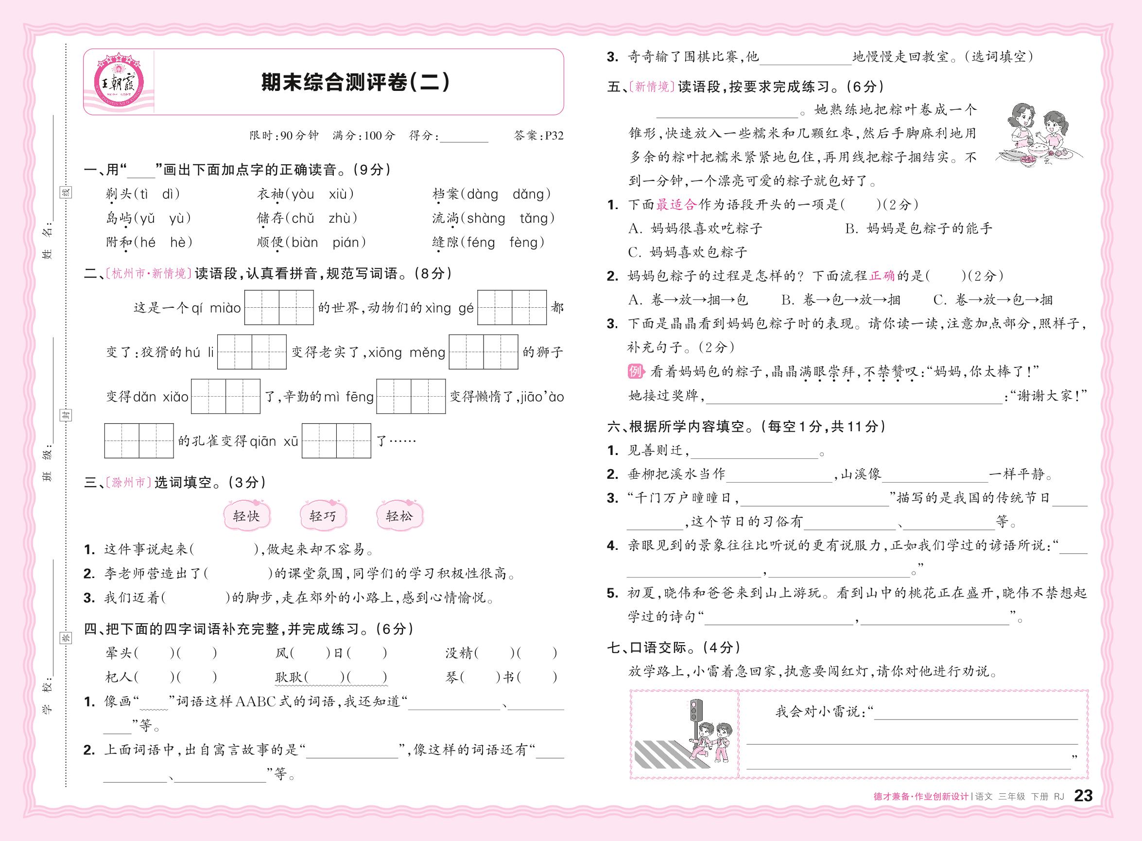 2024春下册三年级语文人教版 期末综合测评卷(二)