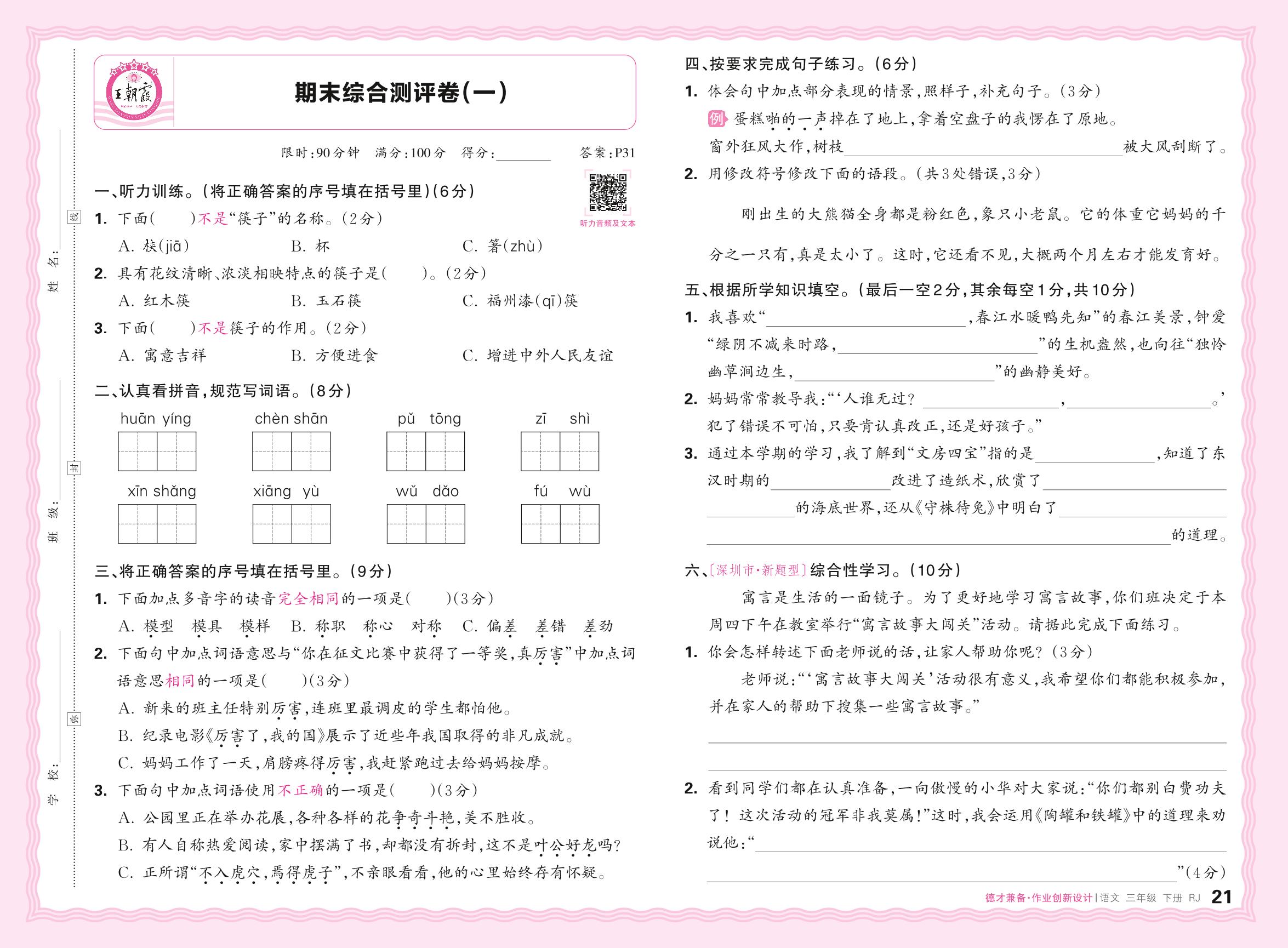 2024春下册三年级语文人教版 期末综合测评卷(一)