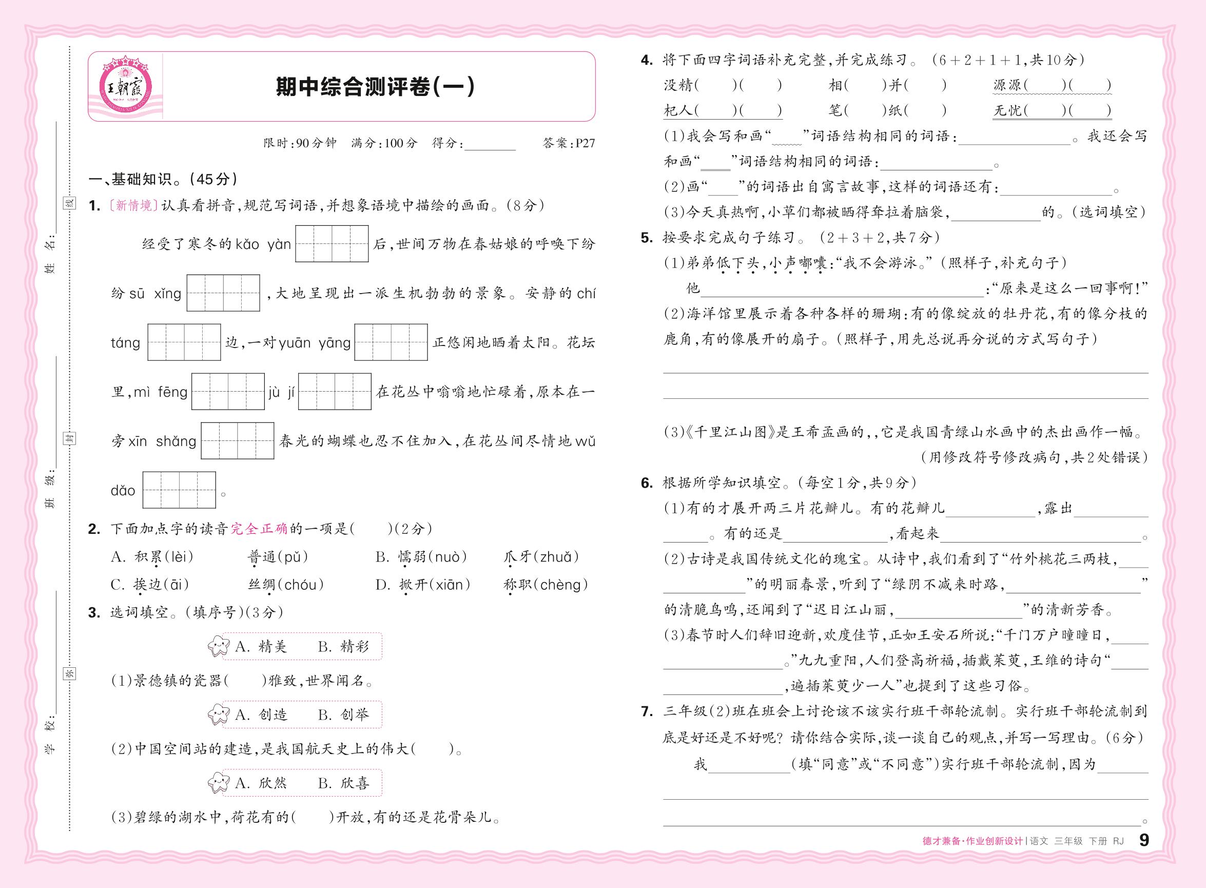 2024春下册三年级语文人教版 期中综合测评卷(一)