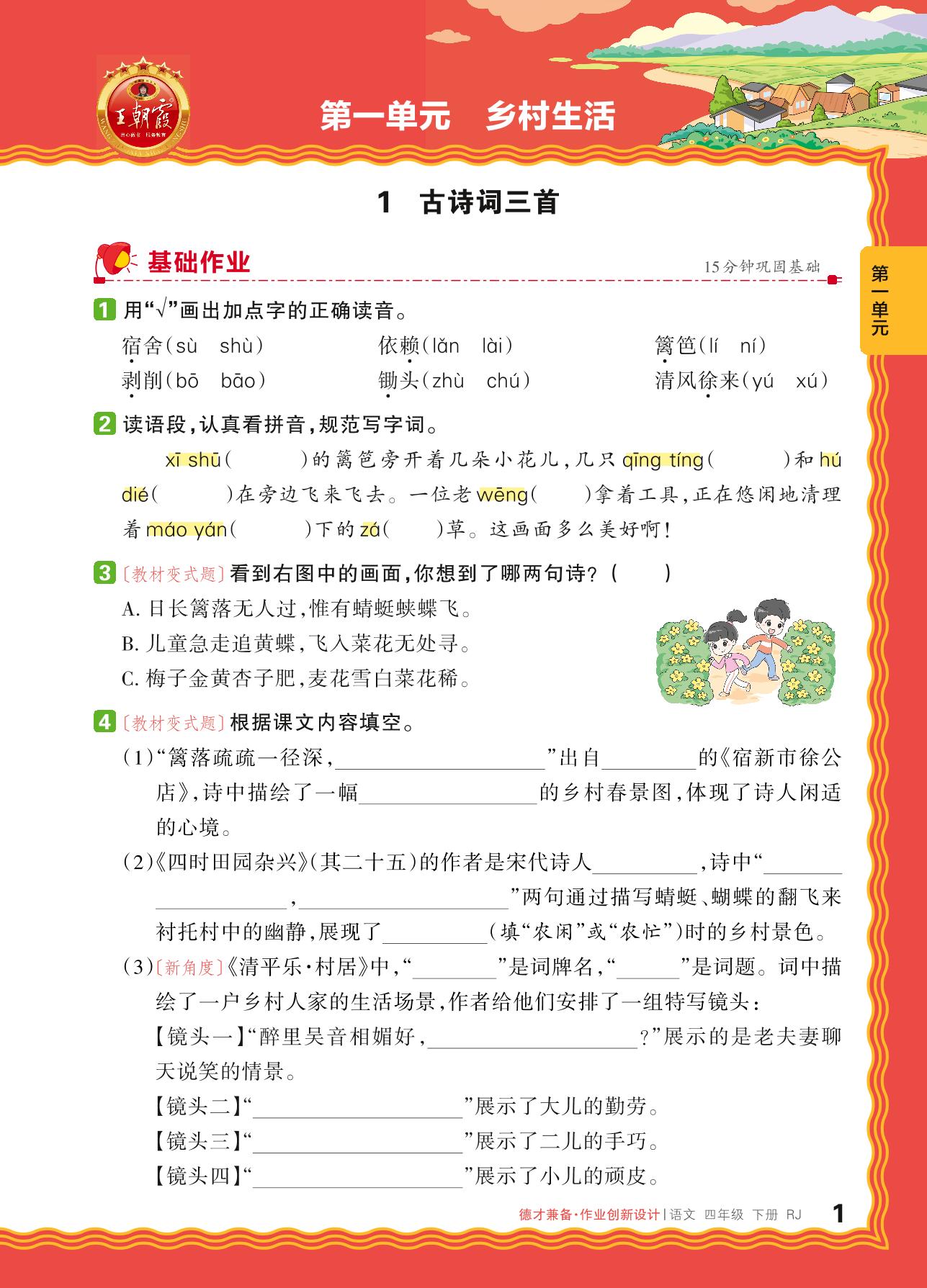 2024春下册四年级语文人教版 第一单元 乡村生活——1. 古诗三首