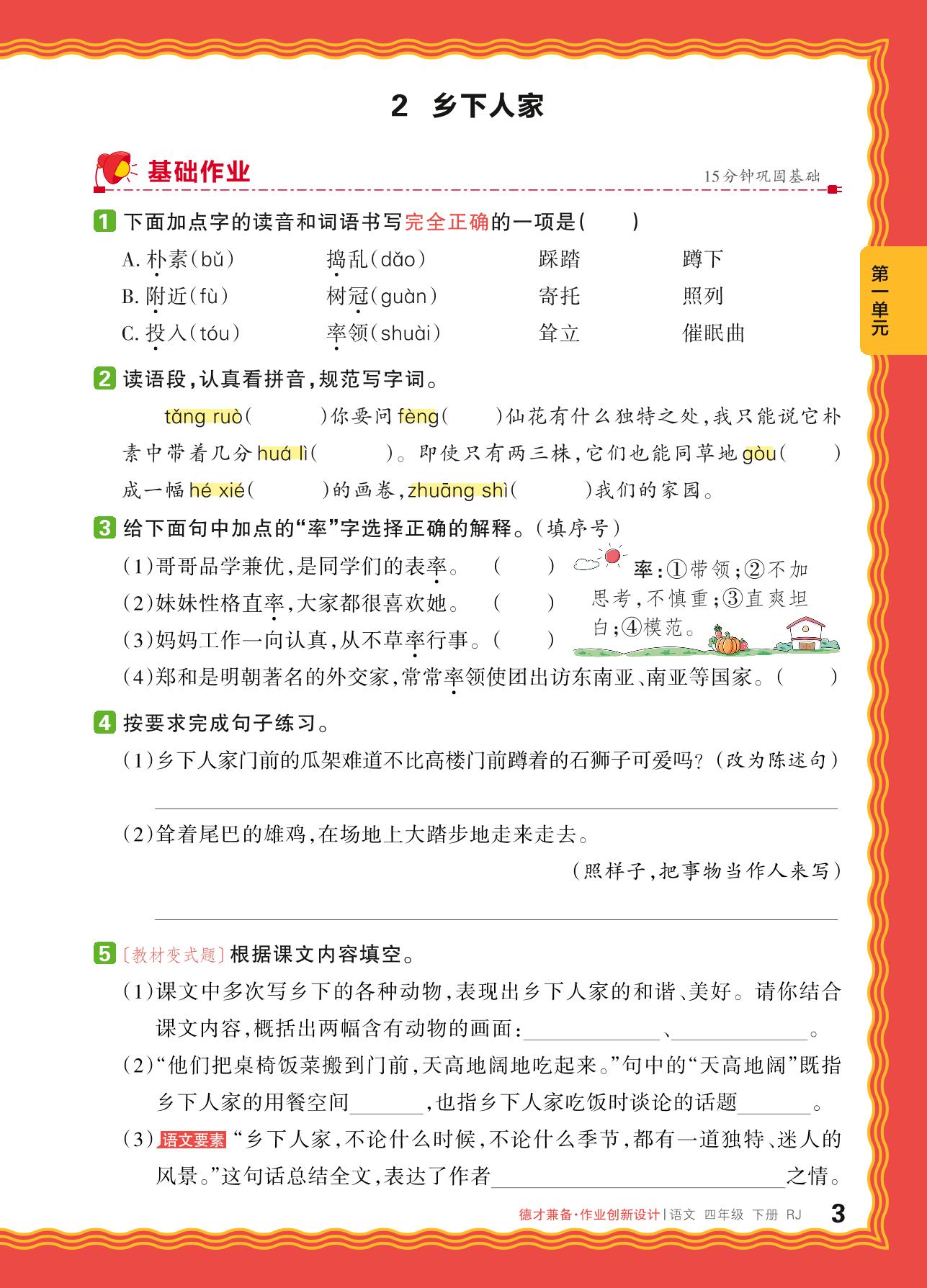 2024春下册四年级语文人教版 第一单元 乡村生活——2. 乡下人家