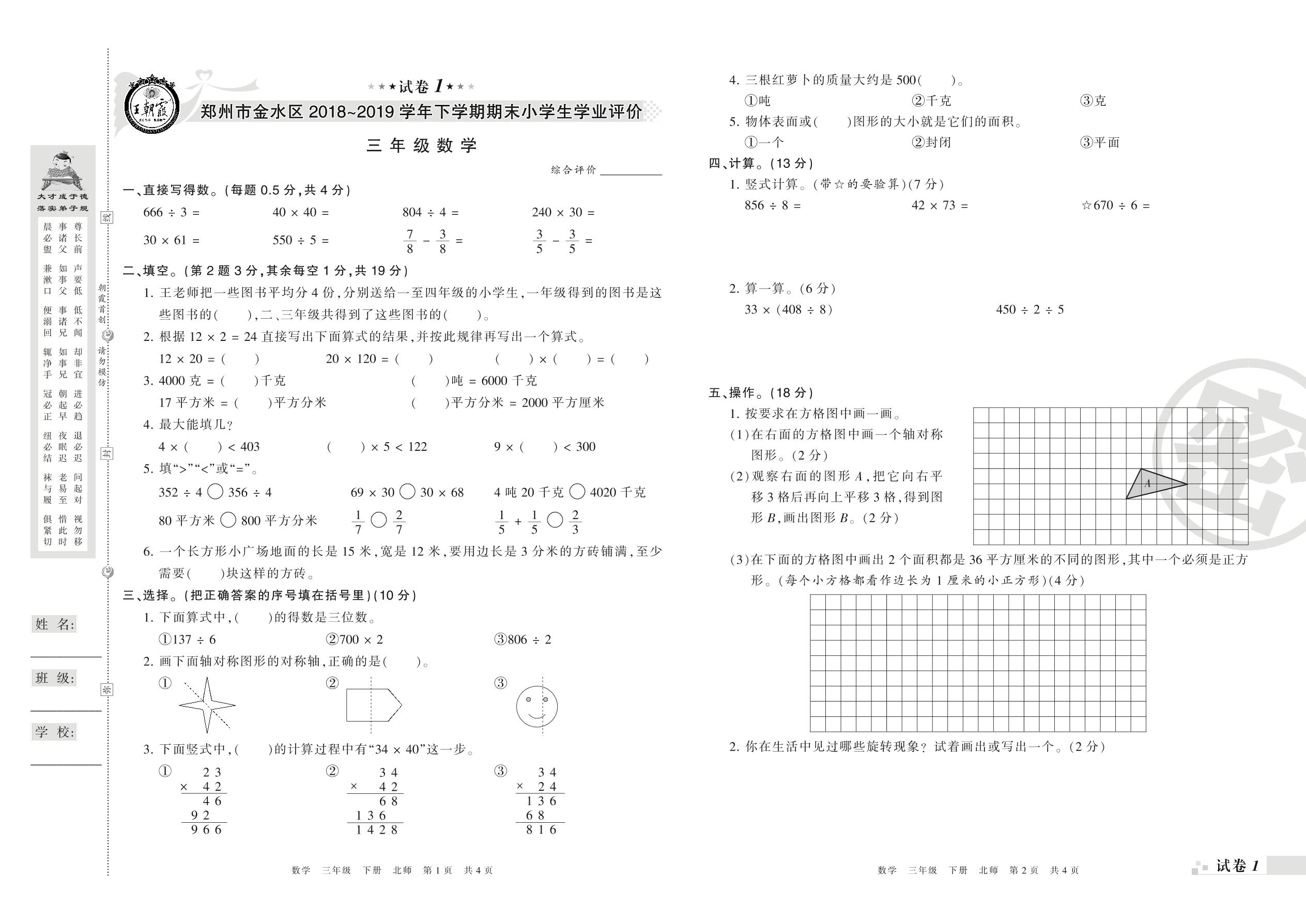 2018-2019学年第二学期郑州市金水区三年级数学试卷(北师版)_R21080494518【1】