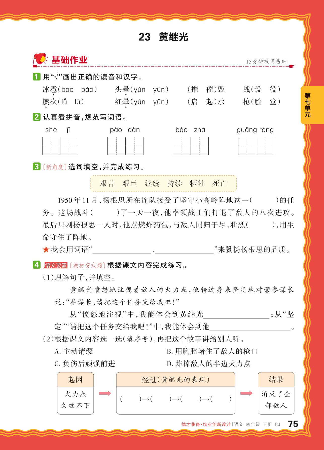 2024春下册四年级语文人教版 第七单元 人物品质——23. 黄继光