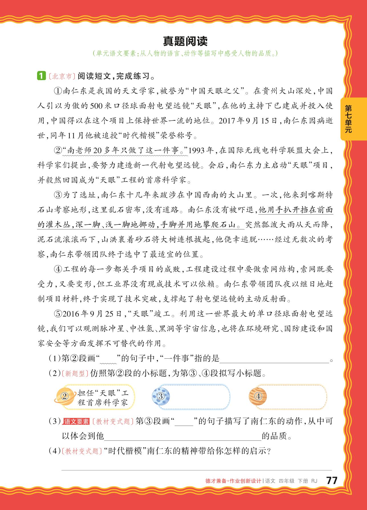 2024春下册四年级语文人教版 第七单元 人物品质——真题阅读