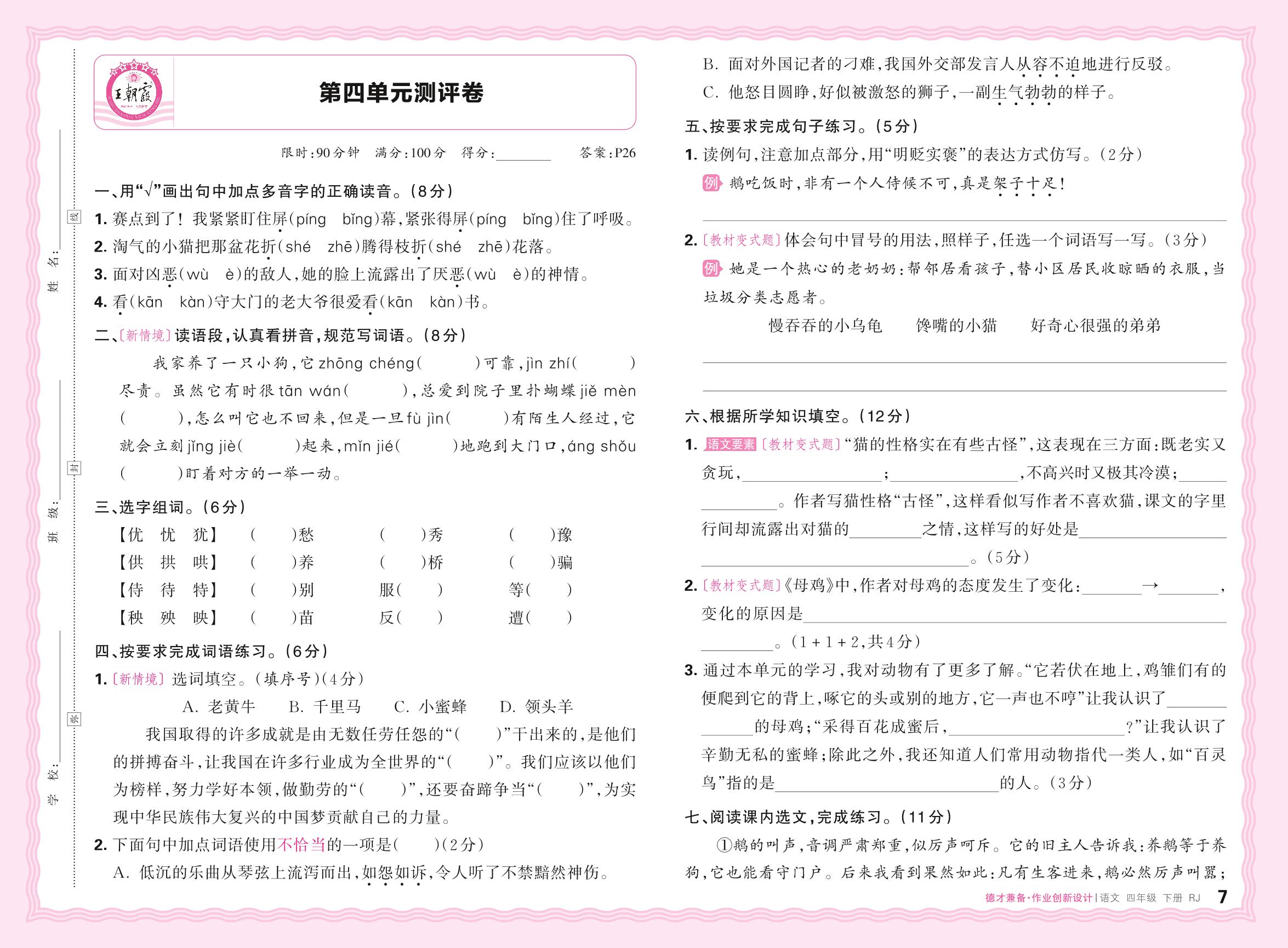 四年级语文人教版下册单元卷